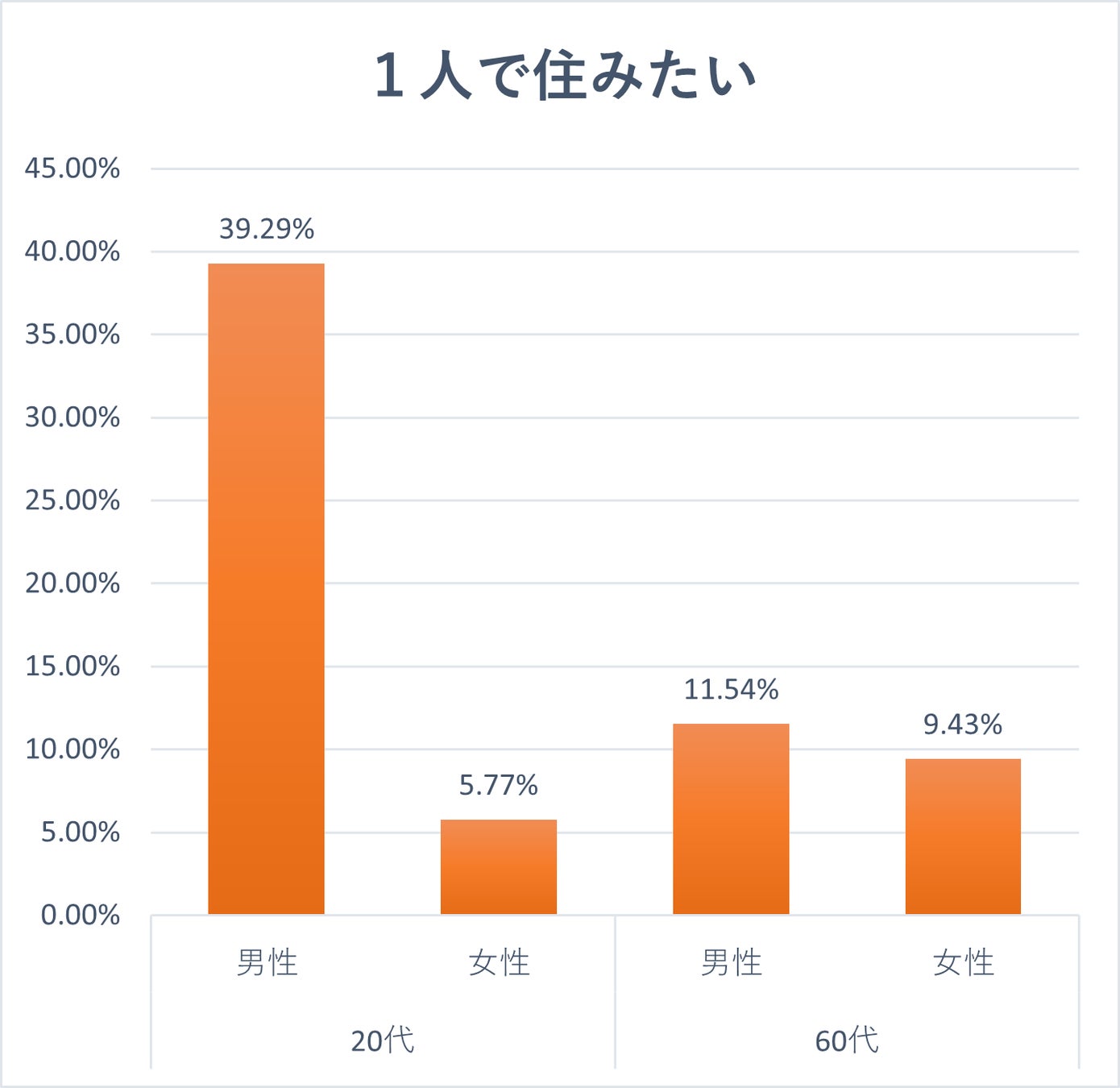 一方で、若年層では20代男性の約39%が一人暮らしを望む一方、女性は5.7%にとどまっています。若い男性の「自由を重視したい」という価値観が背景にあり、女性は家族とのつながりや安全面を重視する傾向が強いことが見て取れます。