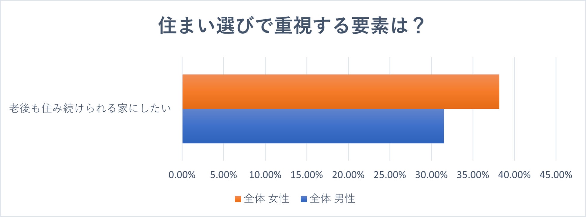 女性の38.17%が「老後も住み続けられる家」を重視しており、将来を見据えた住まいづくりでリードしていることが分かります。一方、男性も31.51%と、女性には及ばないものの、意外にも多くが老後の安心や安定を意識していることがわかりました。男性は現在の生活スタイルや利便性を優先する傾向がある中で、約3割が将来の暮らしを考えた住環境の重要性を認識しています。女性が未来志向で主導する一方、男性も徐々に同じ方向性を見据えている姿が、この結果から浮かび上がります。