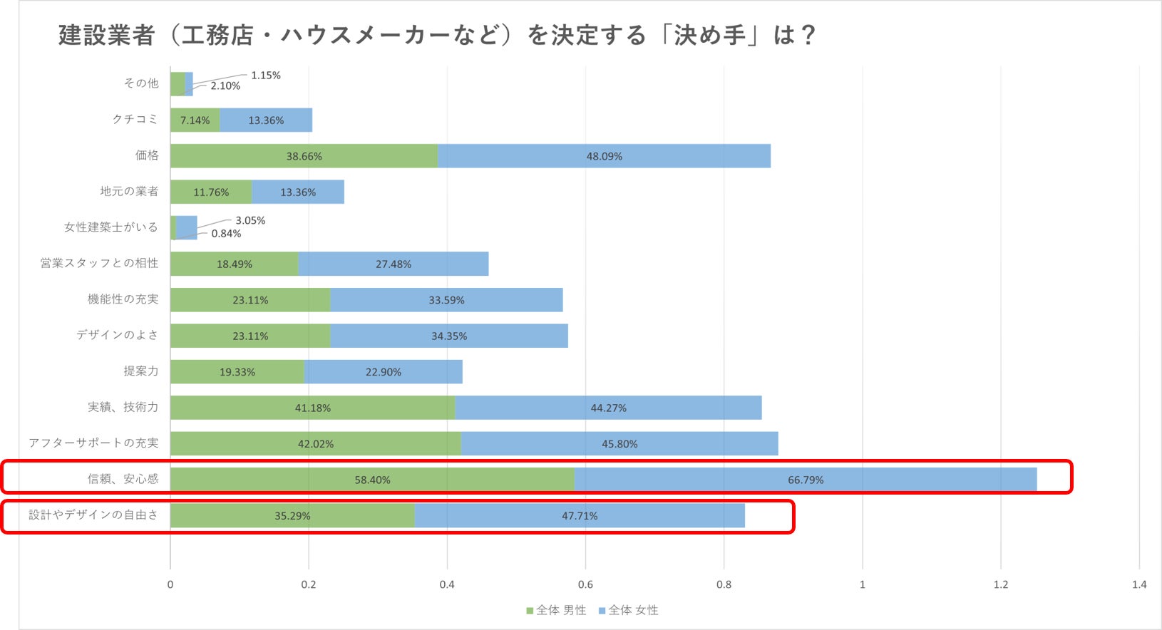 住宅選びでは「信頼・安心」が最も重視され、男性58.4%、女性66.79%が建設業者選びの決め手として挙げています。災害や不正施工の報道が信頼への期待を高めたと考えられ、施工の透明性や品質管理が重要視されています。
