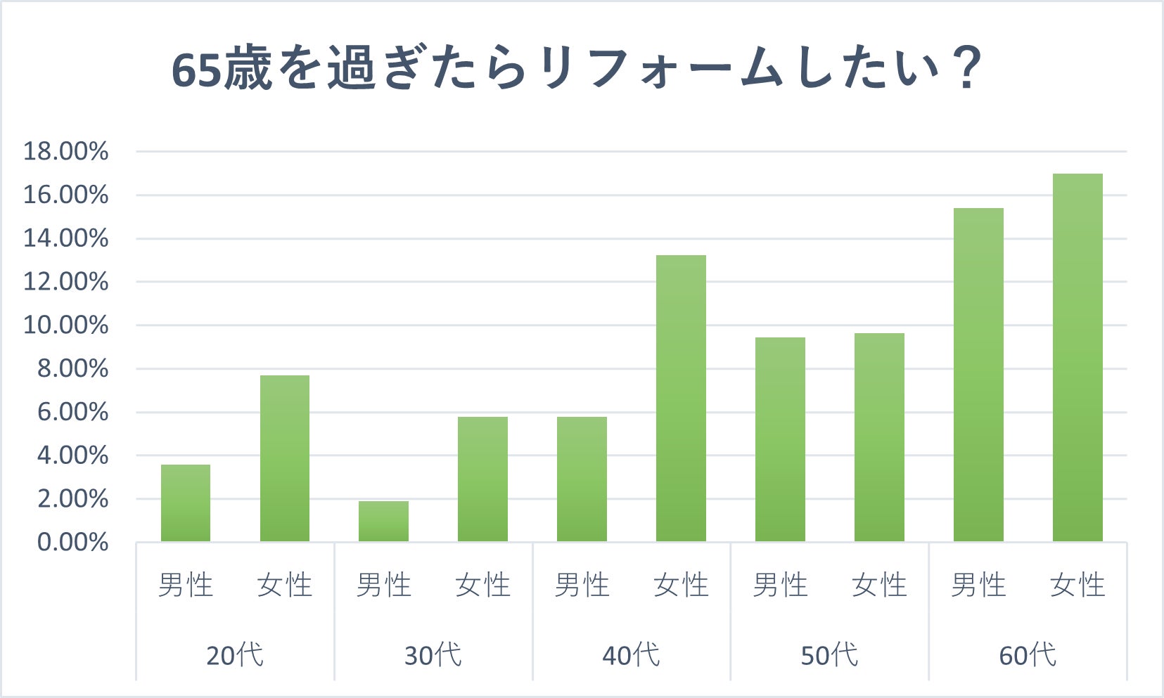 女性は全ての年代で男性よりもリフォーム意向が高いことが明らかになりました。特に60代女性では約18%がリフォームを希望しており、バリアフリー化や安全性向上など、老後を見据えた住環境の改善を重要視していることが伺えます。日常的に住まいの快適さや利便性を重視する女性ならではの視点が、早期からのリフォーム意向の高さにつながっていると考えられます。