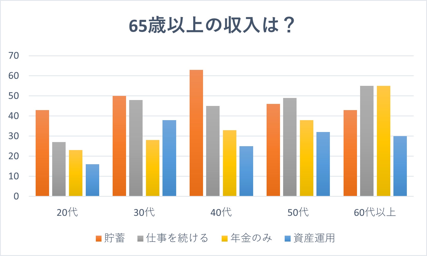 若い世代では、「貯蓄」を重視する傾向が強く、特に20代では将来の結婚や老後を見据えた備えが優先されています。非正規雇用の増加や年金への不安が「安全策」としての貯蓄志向を後押ししていると考えられます。一方で、資産運用の知識や経験不足からリスクを避ける傾向も見受けられます。