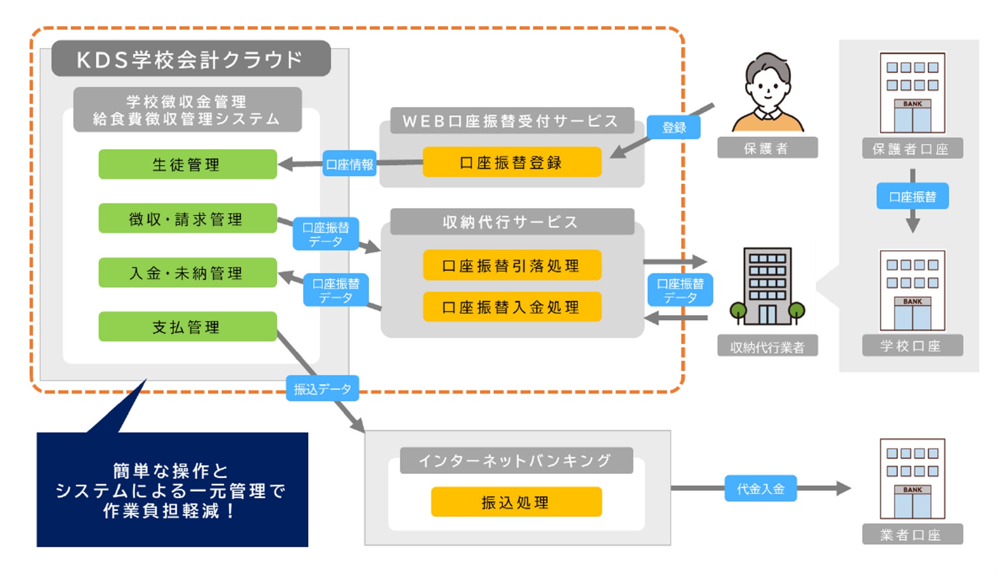 「KDS学校会計クラウド®」は、学校徴収金や給食費、入学料、授業料などの会計業務を効率化するクラウド型業務支援システムです。
