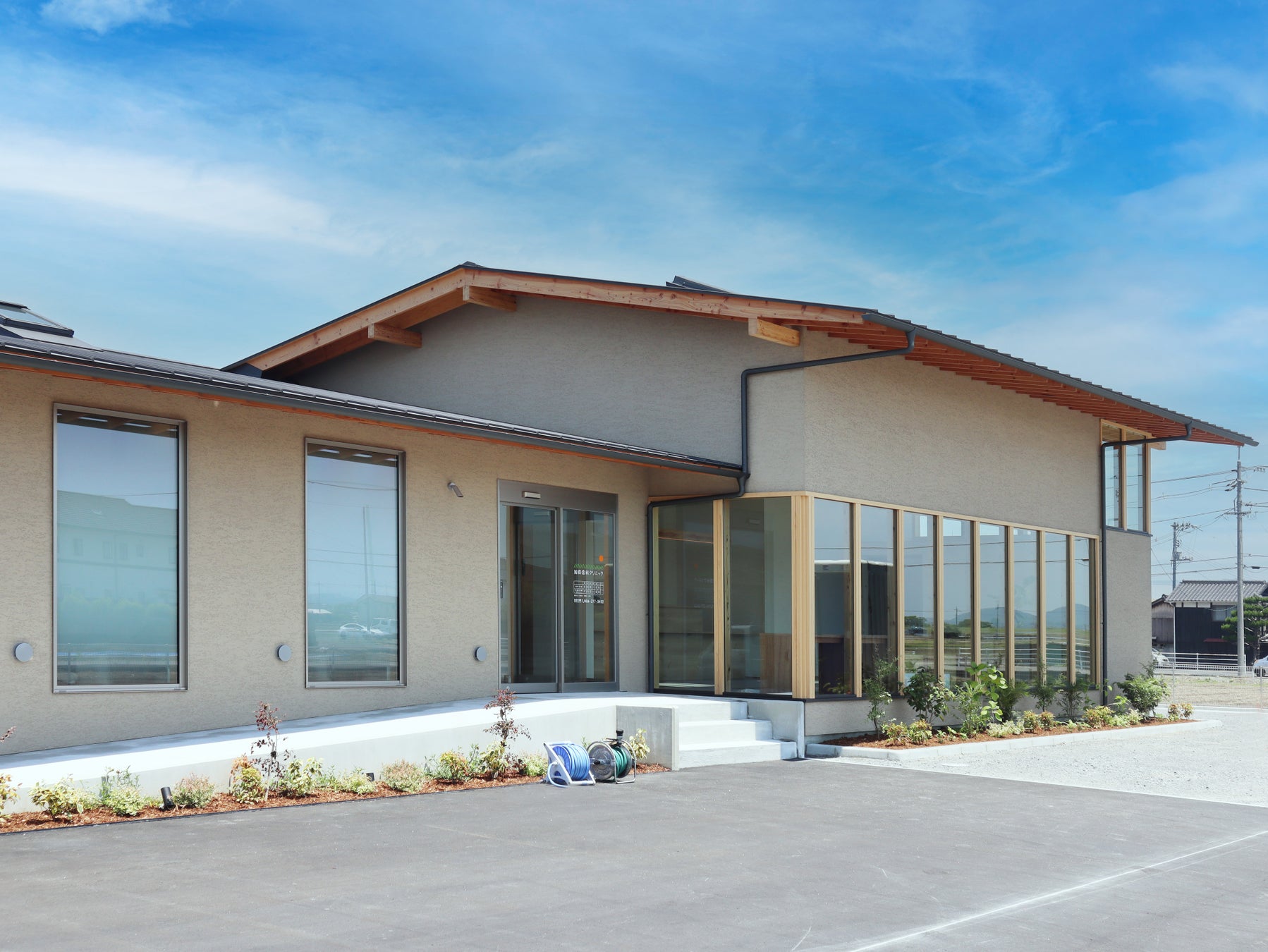 外観コンセプトを生かせるよう、土の色を採用した外壁と木で構成した屋根と木製サッシ等、自然素材を組み合わせて構成し、施工しました。緑の鮮やかな若い苗の風景、青々とした稲の風景、黄金色の稲穂の風景、収穫が終わった後の乾いた土色の風景等、どの季節の風景にも溶け込むことを体現しています。