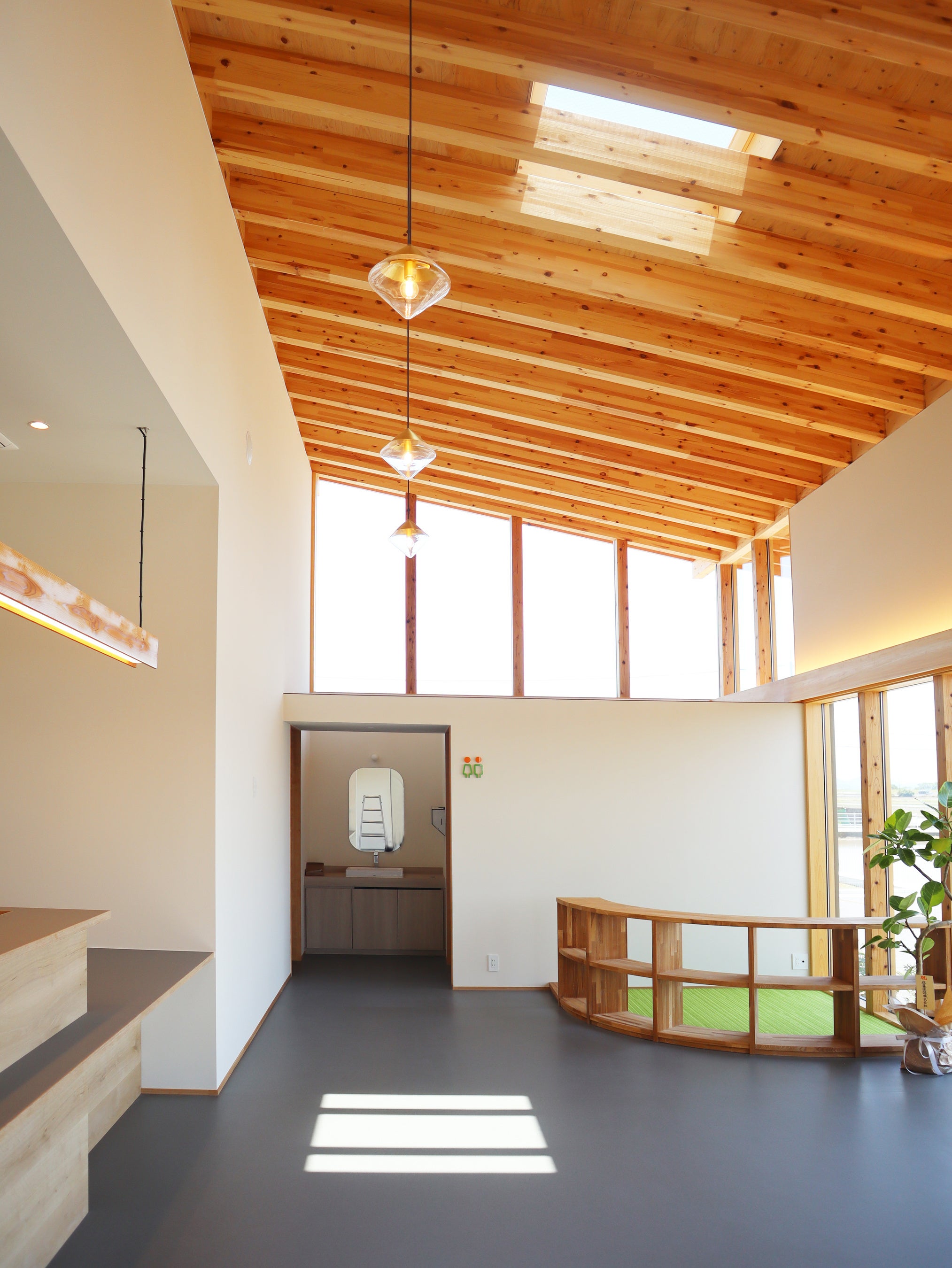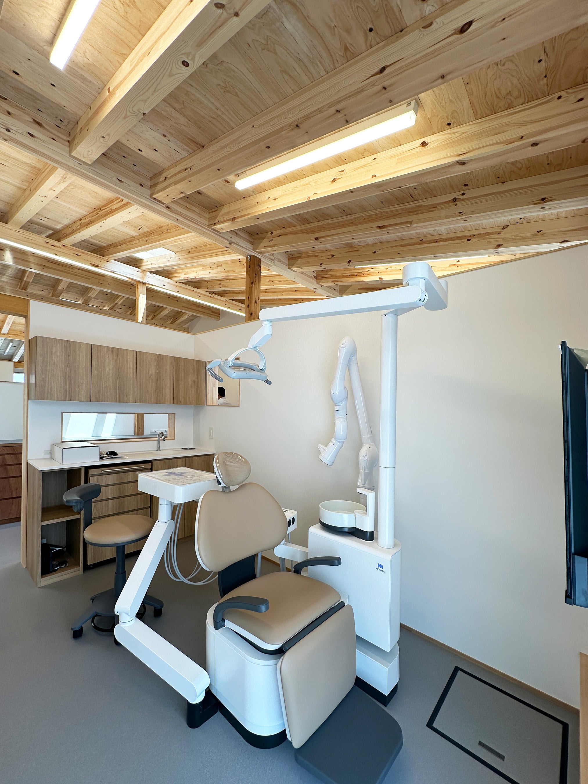 内観は、切妻屋根の建築の形状とその屋根の木構造を素直に表現できるよう施工しました。待合室には切妻屋根の棟を偏心させて、高い天井高としており、南側の水田方向と東側の上部の空の方向に木製建具の大開口を設けることで、開放的で明るい空間に仕上がりました。診察室のエリアは、技工・消毒コーナーを中心に、外部側に診察室が並ぶように配置し、それぞれの治療室から田園風景や、空の風景を眺めることができるようにしています。