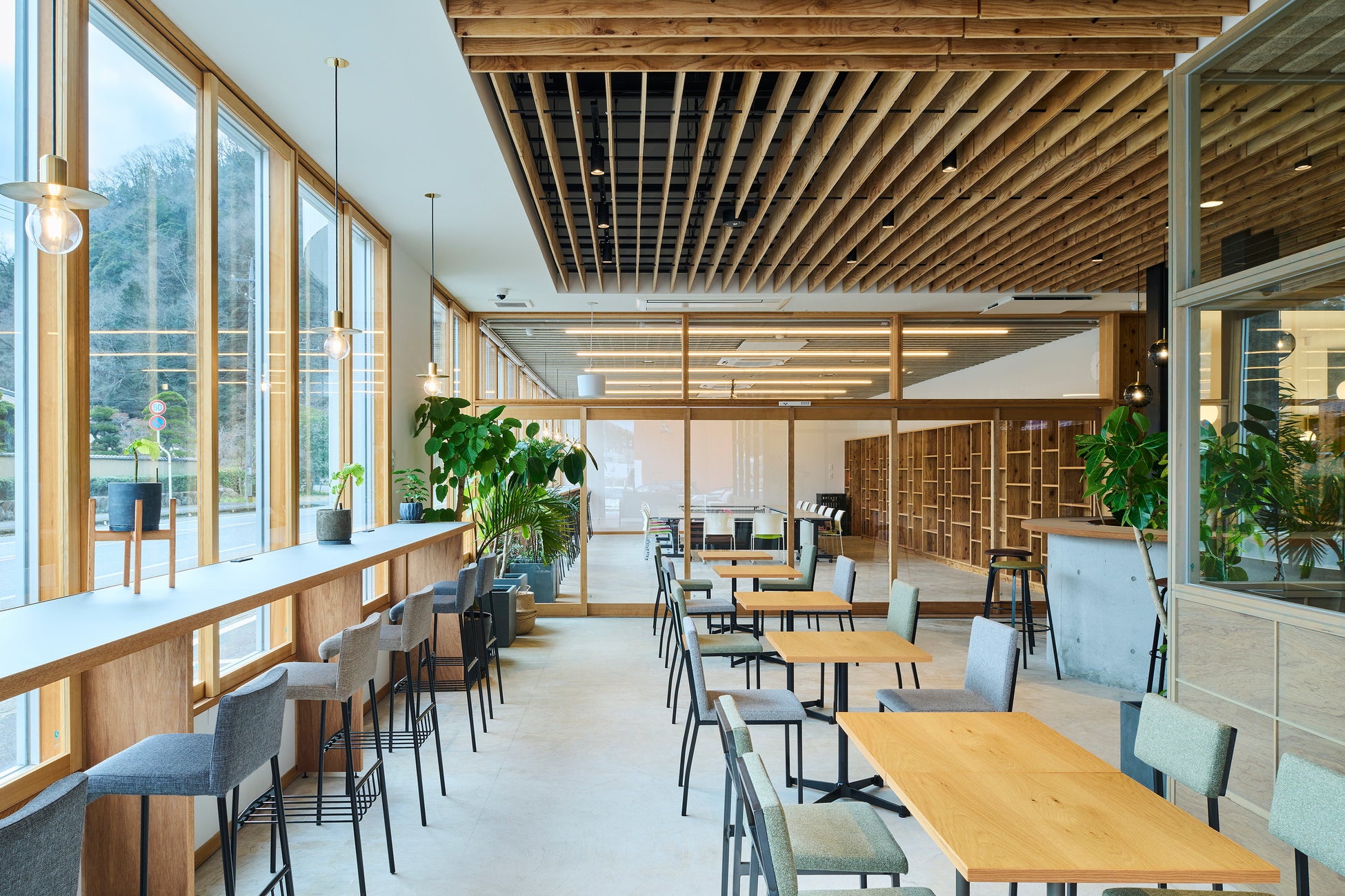 =【写真左】設計を担当した西井洋介(岡山ドリームラボ所属)。【写真中央】西井が設計を担当し、ベル・ホームが施工した商業店舗事例「roastery cafe 縮図」(岡山県倉敷市)。【写真右】「岡山ドリームラボ」(OKAYAMA DREAM LAB.)事務所内観(岡山県美作市) 。佐藤建設が家づくり、街づくり、コミュニティづくりを応援する、地域に開かれたクリエティブ施設です。