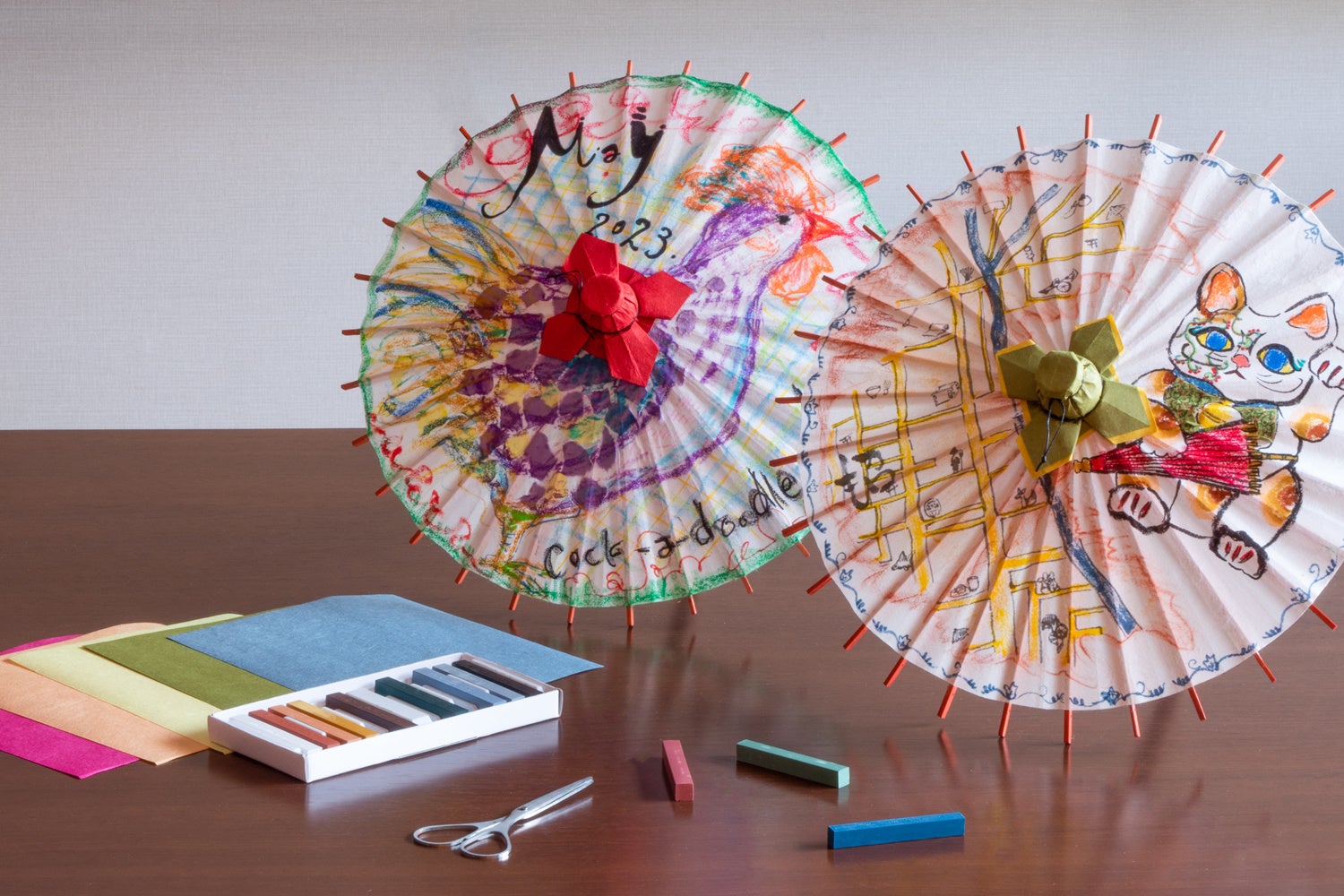 今回のワークショップでは、小さな京和傘の竹骨組みに、京和傘の製作過程で出た和紙の切れ端や、カラフルな折り紙などをコラージュし、自由にペンなどでお絵描きをして、オリジナルのミニ京和傘を作っていただきます。当日は京和傘職人の小野寺克洋(おのでら・かつひろ)氏が、京和傘の伝統や作り方などを説明しながら、丁寧にサポートいたします。