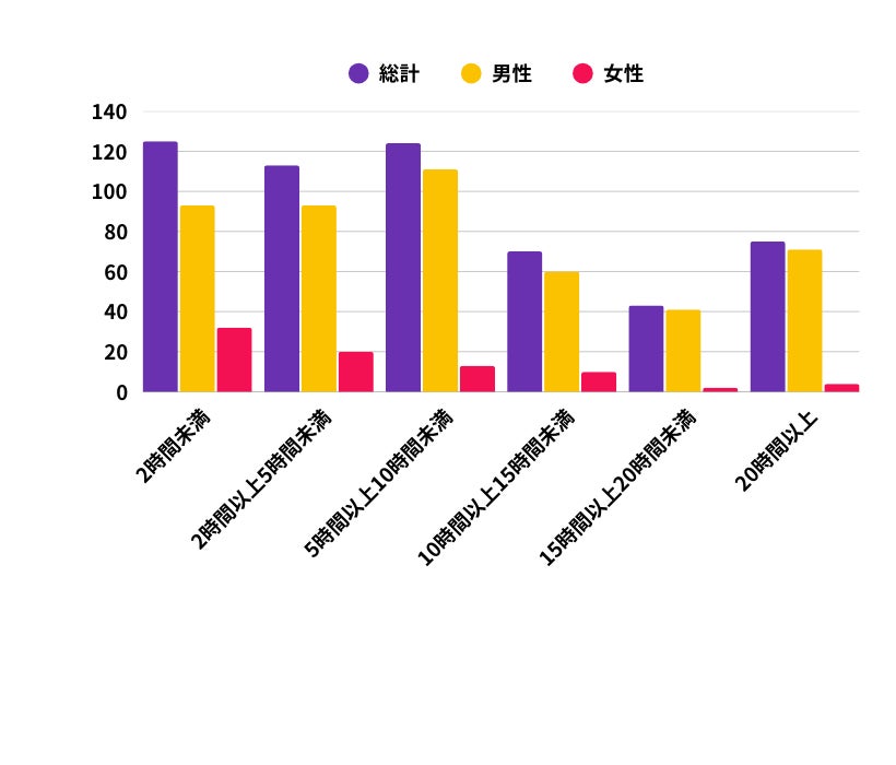 性別ごとに見ると、女性では1週間のゲーム時間が2時間未満の人が男性より多く(女性約42%、男性約30%)、逆に男性では20時間以上の人が女性より多い傾向が見られます(男性約10%、女性約6%)。これらの差は中間の時間帯(2時間以上15時間未満)ではほとんど見られず、ゲーム時間が少ない層と極端に多い層で男女差が顕著です。全体として、男性はより長い持間をゲームに費やし、女性のゲーム時間はそれに比べて短い傾向が見られます。
