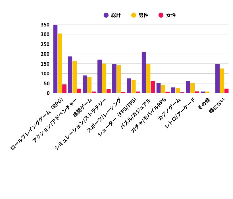性別ごとの傾向を見ると、男性はロールプレイングゲーム(約50%)やスポーツ/レーシング(約23%)を好む割合が高く、女性はそれぞれ約37%と約4%にとどまっています。反対に、女性はパズル/カジュアルゲームを強く支持しており(約53%)、それに対し、男性は約24%と差が見られます。