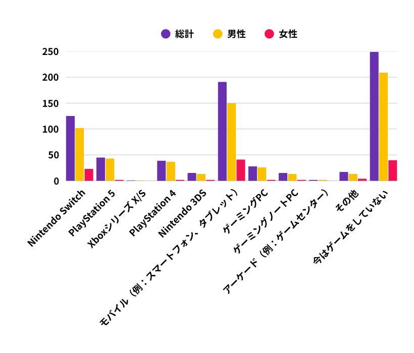 回答者の約34%は現在ゲームをしておらず、一方で、ゲームをしている人の間では、モバイル端末(26%)とNintendo Switch(17%)が最もよく使われています。それに対して、PlayStation 5、PlayStation 4、ゲーミングPCなど、その他のプラットフォームの利用率はあまり高くありませんでした。