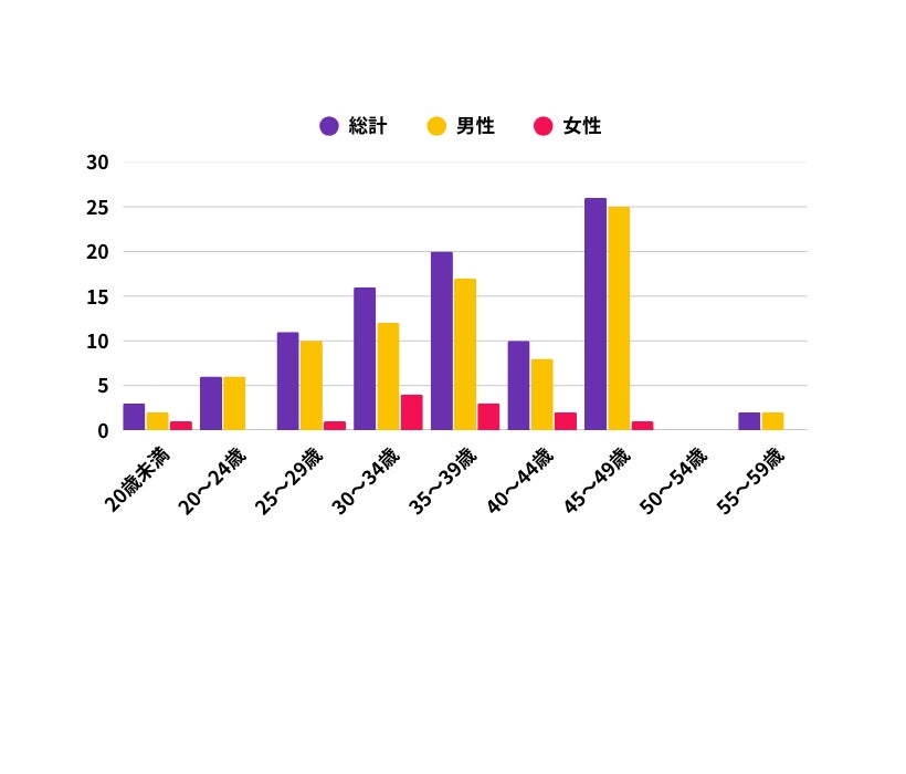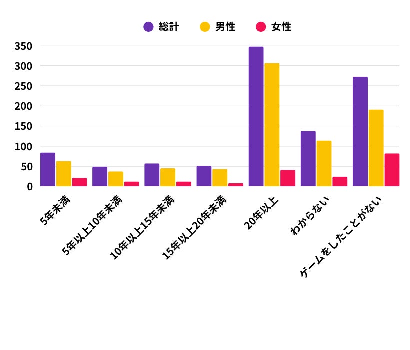 性別で見ると、20年以上のゲーム歴がある人が男性の約38%なのに対し、女性では約21%と少なく、長期のプレイ歴に男女差が見られます。反対に、「ゲームをしたことがない」と答えた女性は約42%で、男性(約24%)よりもかなり多く、ゲーム経験の有無に大きな差があります。それ以外の経験年数では、男女の割合に大きな違いは見られませんでした。