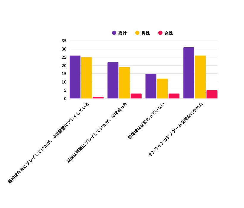 回答結果によると、オンラインカジノゲームへの関わり方は時間とともに様々な方向に変化しています。以前より頻繁にプレイするようになった人が約28%いる一方で、プレイ頻度を減らした人が約23%、完全にやめた人が約33%います。また、ほとんど変化がなかった人は約16%です。これらの結果から、利用パターンは多様化しており、特に一定数がオンラインカジノゲームから離れていることがわかります。