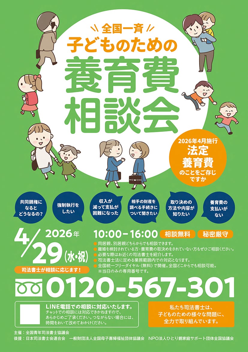 全国青年司法書士協議会(所在地:東京都新宿区、会長:岩田 豪)は、「全国一斉子どものための養育費相談会」を2026年4月29日(水・祝)10:00~16:00に開催いたします。