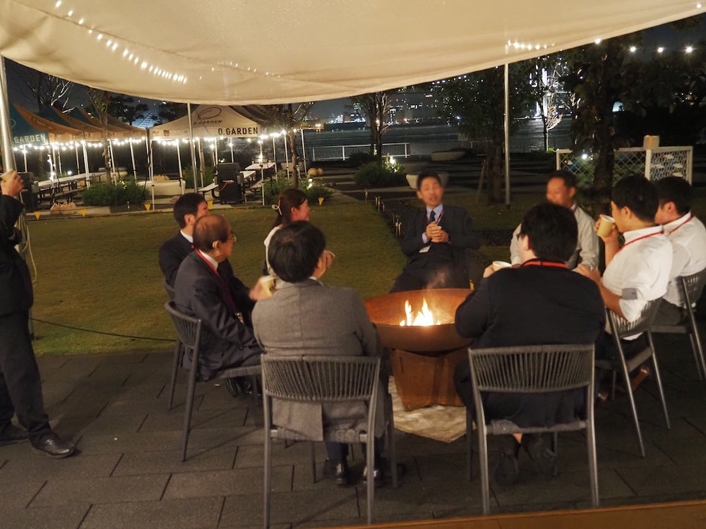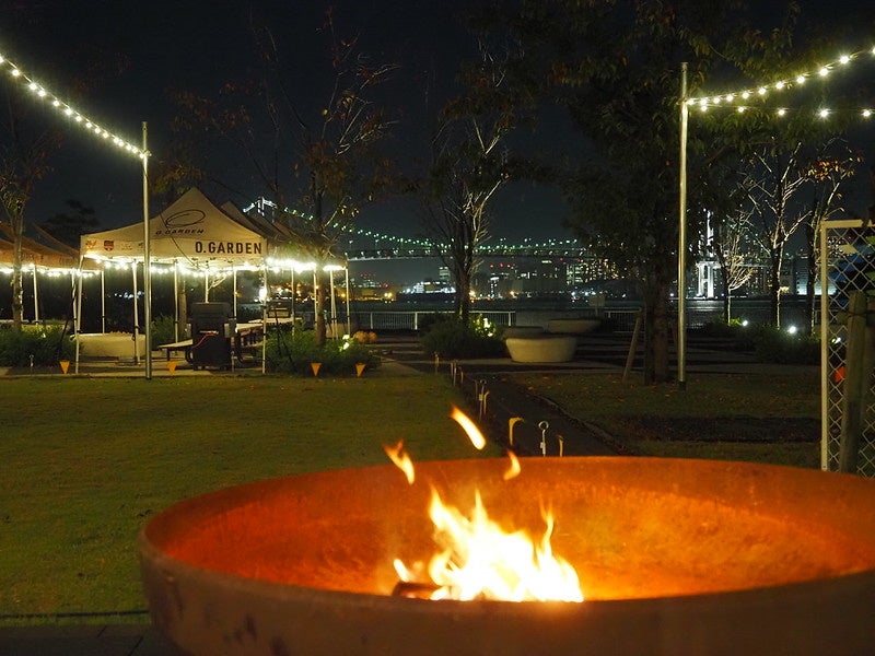 レインボーブリッジ、東京湾を一望できる晴海ふ頭公園内O.GARDEN前に自分たちで焚火台を囲んで楽しめる焚火席を「熾火」と名付けご用意します。