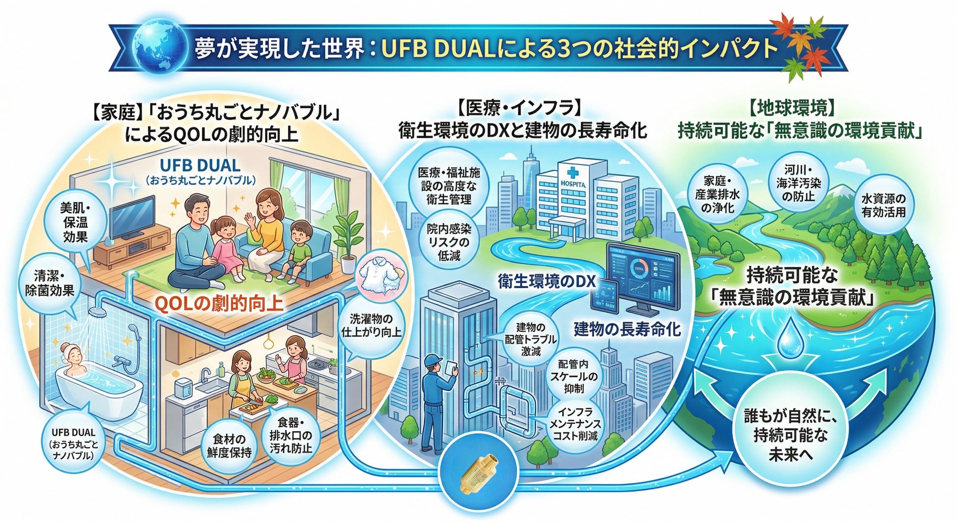 【家庭】「おうち丸ごとナノバブル」によるQOLの劇的向上: 家中すべての水をナノバブル化。浴室では、水道水に比べ保湿持続時間が高まります。肌トラブルを防ぎ、洗剤を最小限に抑え、家事の負担を「無意識に」軽減する豊かな暮らしが定着します。