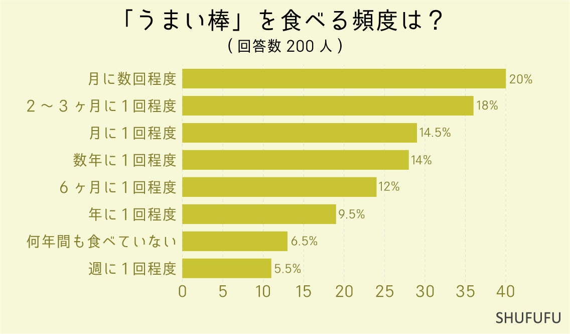200人にうまい棒に関するアンケート調査を行った所、多くの人が1年間に1回以上は食べていることが分かりました。