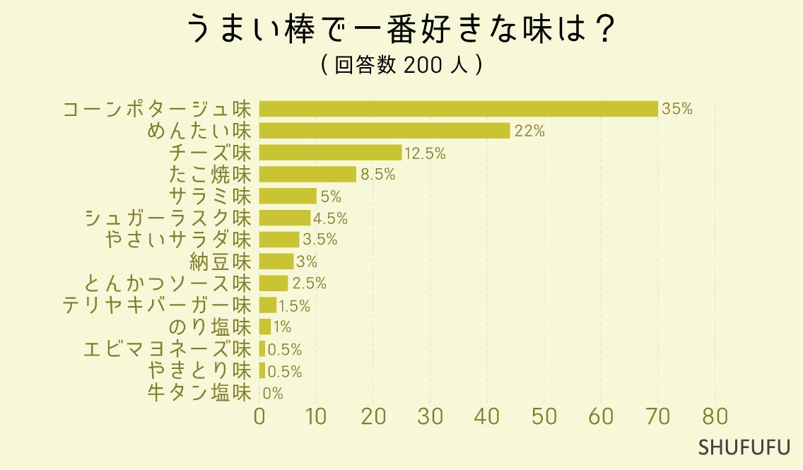 うまい棒で一番好きな味の人気ランキングの1位は「コーンポタージュ味(35%)」でした。