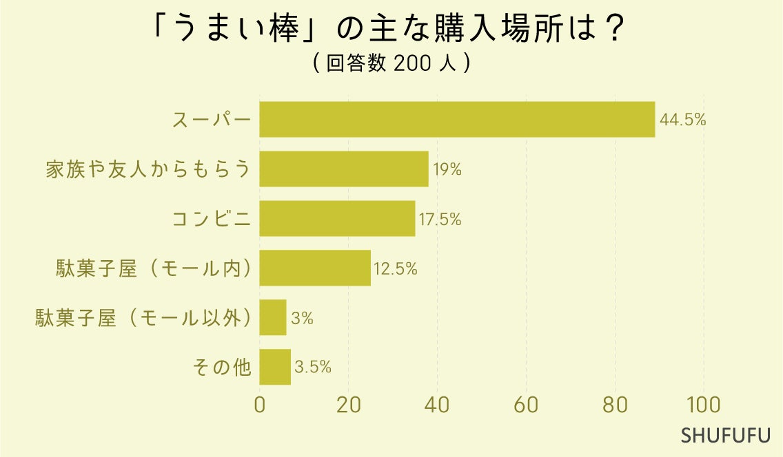 「うまい棒」の主な購入場所は、最も多かった回答が「スーパー(44.5%)」で半数近くの人がスーパーで購入しているとのことでした。
