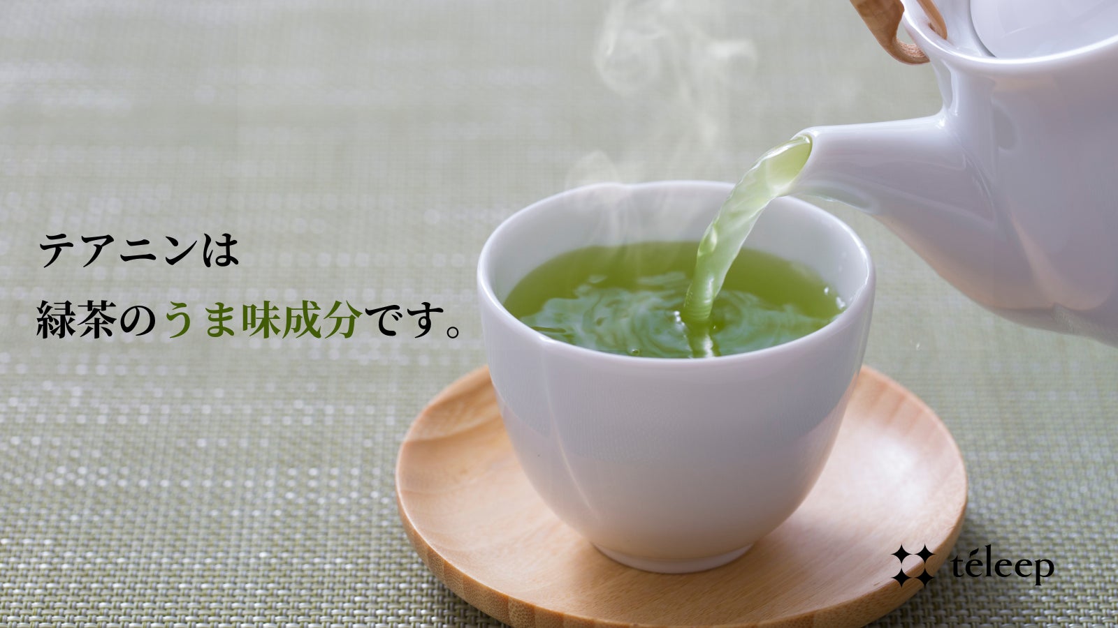 「テアニン」とは、植物の中で緑茶とマッシュルームに含まれるアミノ酸です。低温で抽出した緑茶を飲むと、昆布のような強いうま味を感じますが、まさにそれがテアニンの正体です。テアニンは味だけでなく、一過性の作業にともなうストレス緩和や夜間の良質な睡眠(起床時の疲労感や眠気を軽減)をサポートする効果が報告されています。