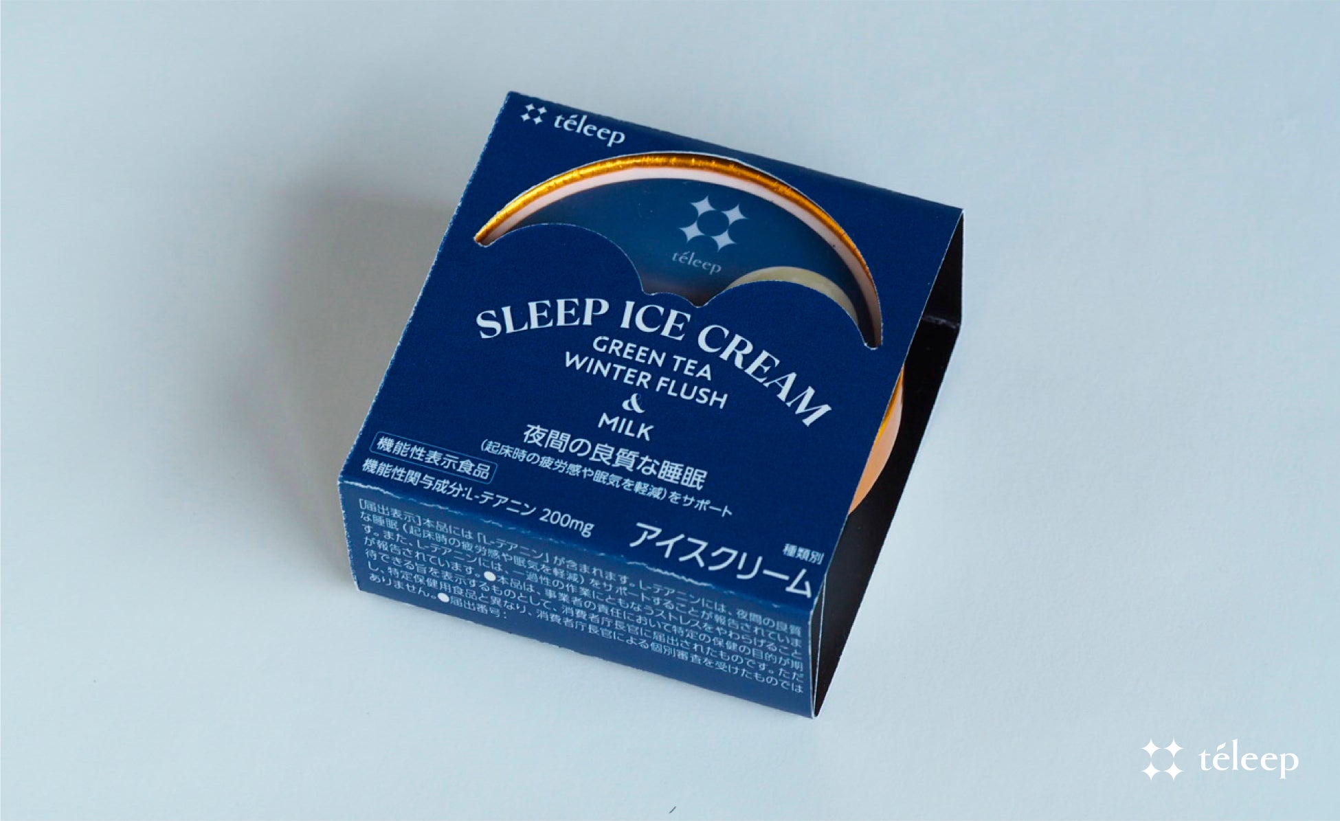 ブランド名であるtéleep(テリープ)は、teaとsleepを組み合わせ「緑茶と睡眠の関係を啓蒙するリーディングカンパニー」としての意味合いを持ちます。本商品では、緑茶のうま味成分である「テアニン」に着目し、一過性の作業にともなうストレス緩和や夜間の良質な睡眠(起床時の疲労感や眠気を軽減)をサポートする緑茶味の機能性表示食品アイスクリームを作りました。