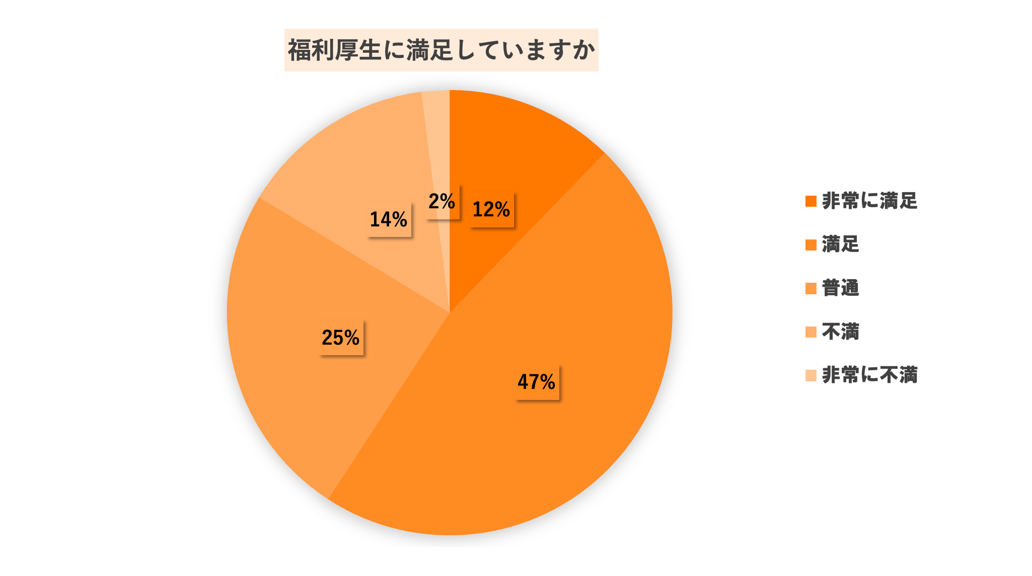 「満足」が最多の47%「非常に満足」が12%と、かなり満足度が高いことが見受けられる結果に。「普通」の25%を含めても、給与・労働環境に比べて全体的に不満が少ない結果となった。
