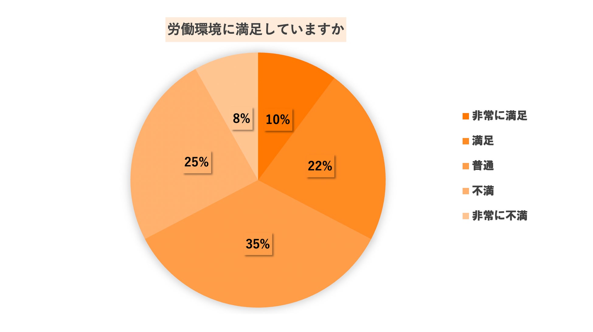 「普通」が最多で35%、次いで「不満」が25%と、給与と比較するとやや不満の声が目立つ結果に。ただ、「非常に不満」は最少の8%、「満足」が22%、「非常に満足」が10%と一定数満足している層も見受けられる。
