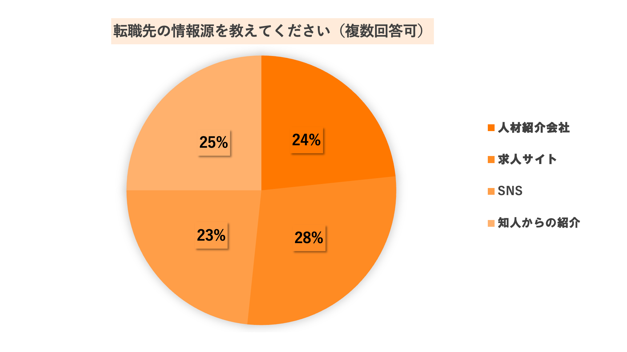 「人材紹介会社」が24%、「求人サイト」が28%、「SNS」23%、「知人からの紹介」が25%と同程度の結果となった。
