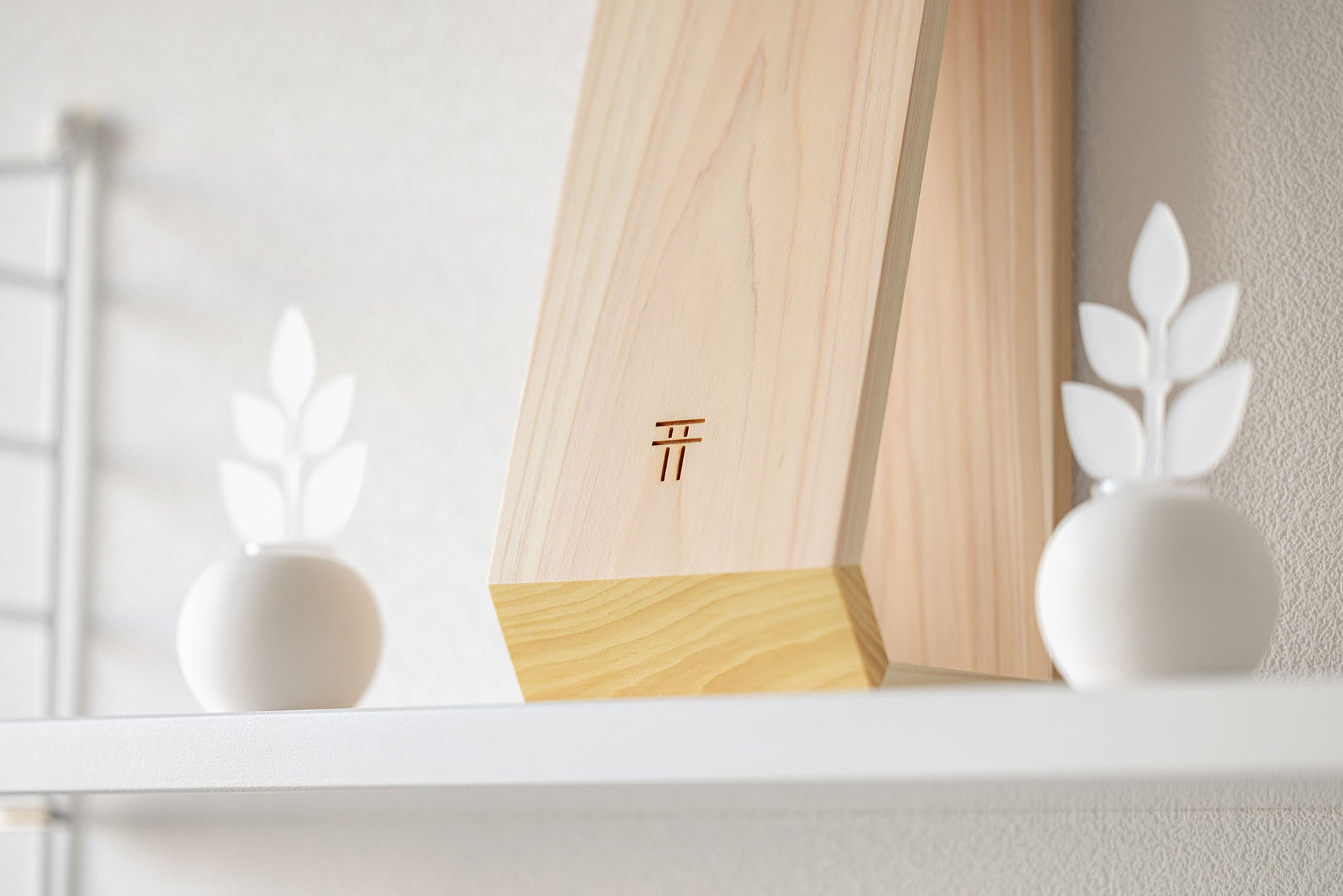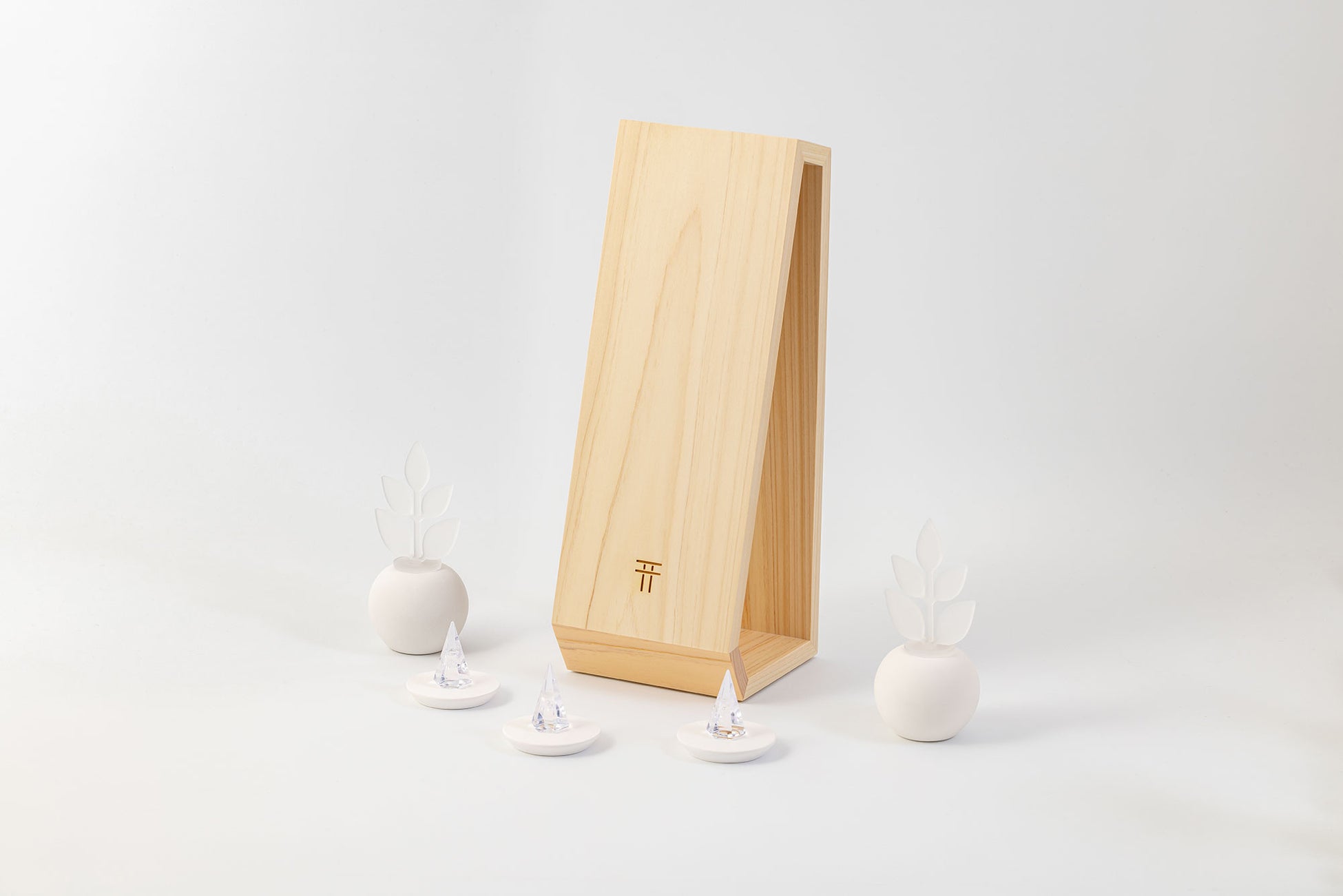 ちょうどいいサイズ感、そしてお手入れのしやすさ、和洋様々なインテリアにも調和するデザイン。一般的な住まい・暮らしに神棚を置くなら…という視点からスタートして生まれた神棚と神具のセットです。