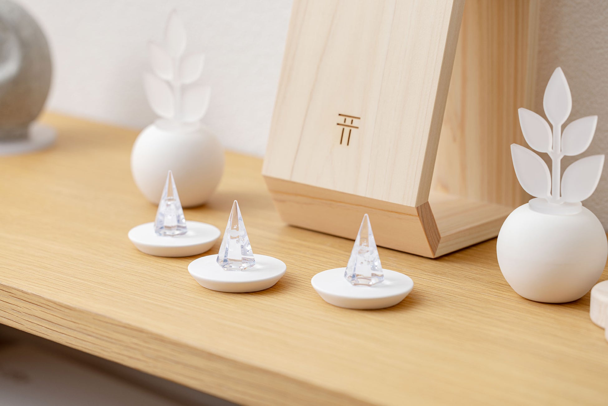 実際の「水・米・塩」を高透明の樹脂に封入した「光のお供え」も日々のお手入れの負担を軽減。「こぼれない・散らからない・軽くて安全」に飾れるお供えオブジェです。お子様やペットさんのいるご家庭、水気を避けたいオフィスや仕事場、衛生面に気を使う飲食店などでも、これなら置けると通年好評を頂いています。