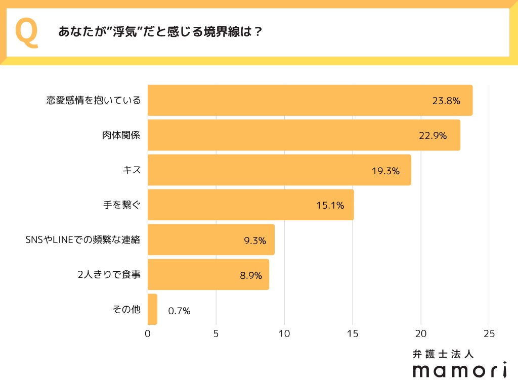 浮気の境界線の最多回答は「恋愛感情を抱いている」23.8%、次いで「肉体関係」22.9%
