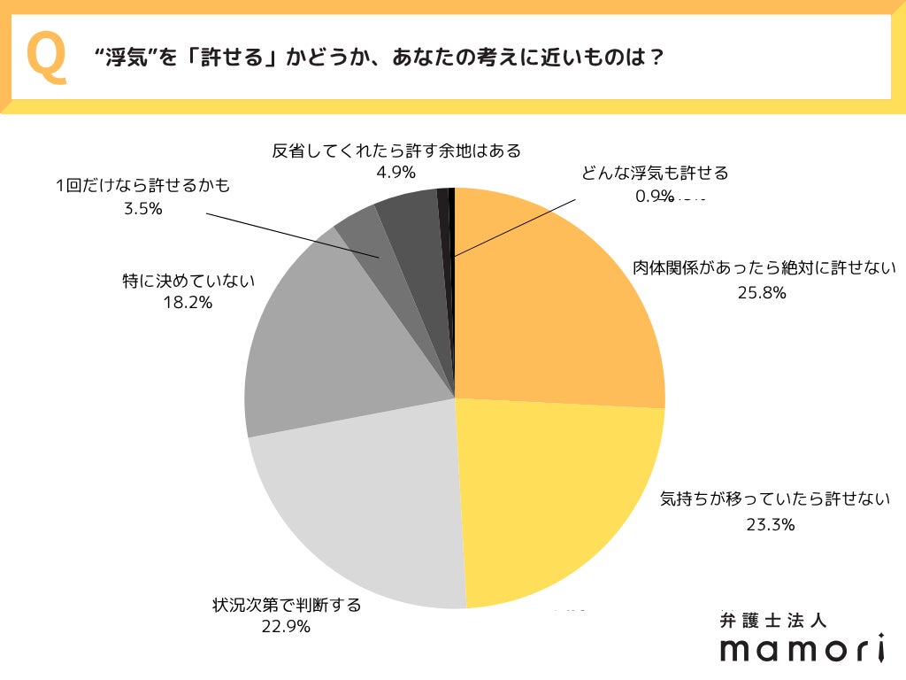 浮気について「肉体関係があったら許せない」25.8%、「気持ちが移ったら許せない」23.3%で、約半数が“浮気は絶対に許せない”