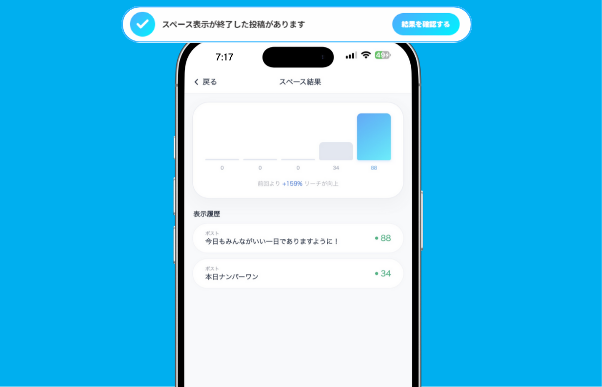 拡散終了時には「結果報告」が届くため、毎日の楽しめるSNSとしてお使いいただけます。