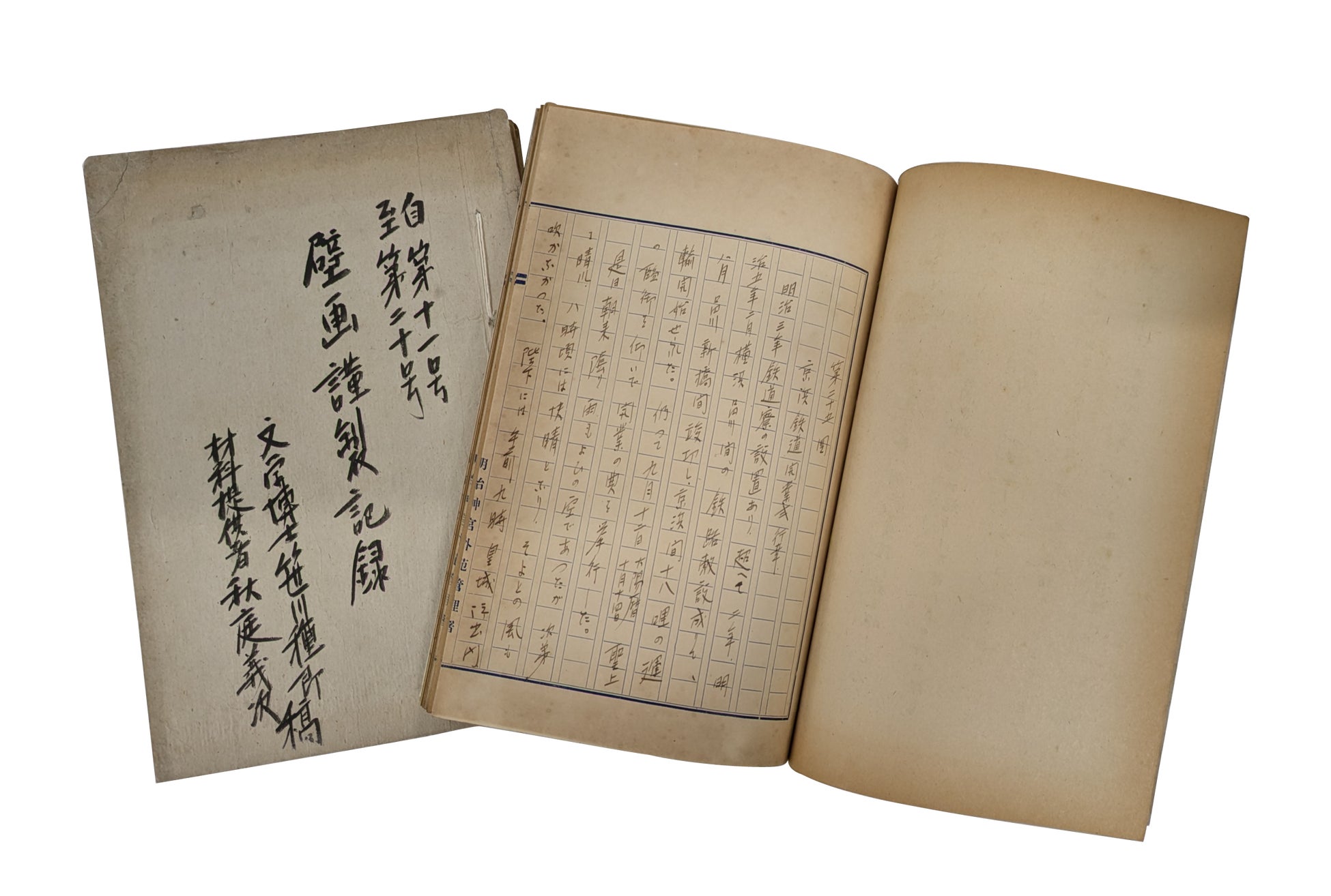 「壁画謹製記録」は、明治神宮奉賛会が壁画の製作経過をまとめた貴重資料です。明治神宮では平成15年刊行の『明治神宮叢書 第十八巻』(国書刊行会)に、同記録を未完成・未公刊資料として翻刻しました。しかし、当時は全80点のうち日本画15点の原稿が「所在不明」のため欠落していましたが、平成26年、宝物殿の整備にあたり、未整理資料群の箱から散逸したと思われていた15点分を含む記録草稿群が新たに見つかりました。本展は、明治神宮が所蔵する壁画内に実際に描かれている明治天皇御物や関係資料などをこれら草稿群と共に展示し、令和5年より開始した未整理資料の調査成果の一部を、皆様にお知らせしようという試みです。