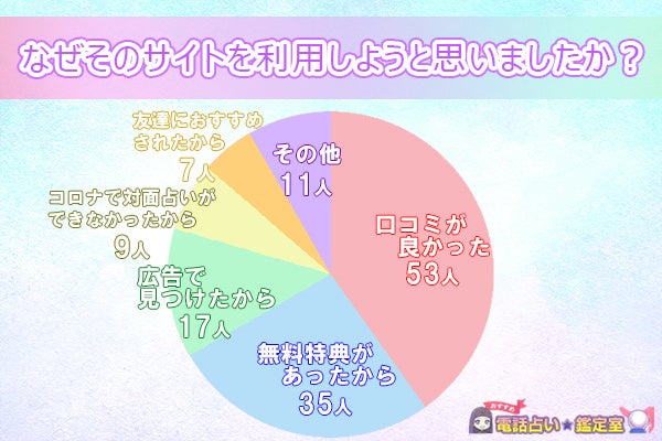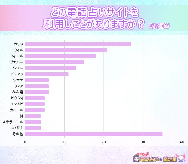 アンケートには多くの電話占いサイトが挙げられており、「その他」の回答が35人と最も多いことから、市場には多数の電話占いサービスが存在し、利用者は広範な選択肢の中から自分の好みに合ったサービスを選んでいることがわかります。