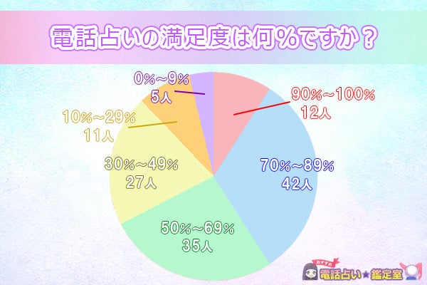 電話占いの満足度は幅広く、最も多いのは「70%~89%」の範囲で、これはサービスが多くの利用者に対して一定の満足度を提供していることを示しています。