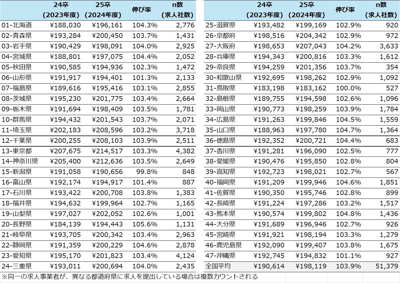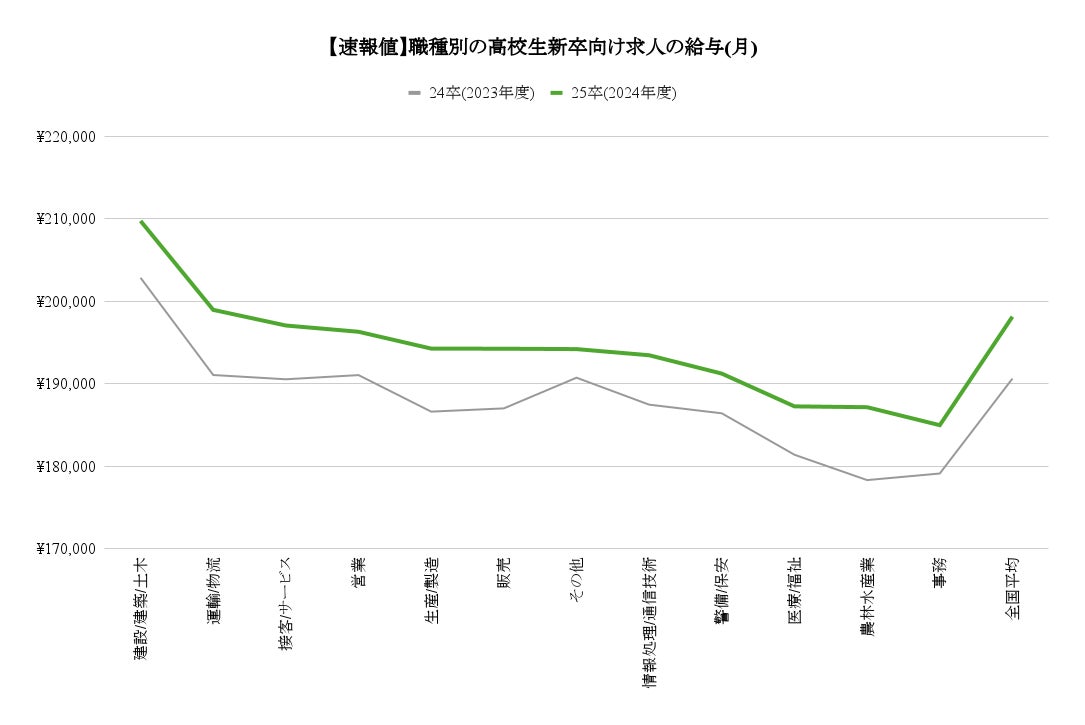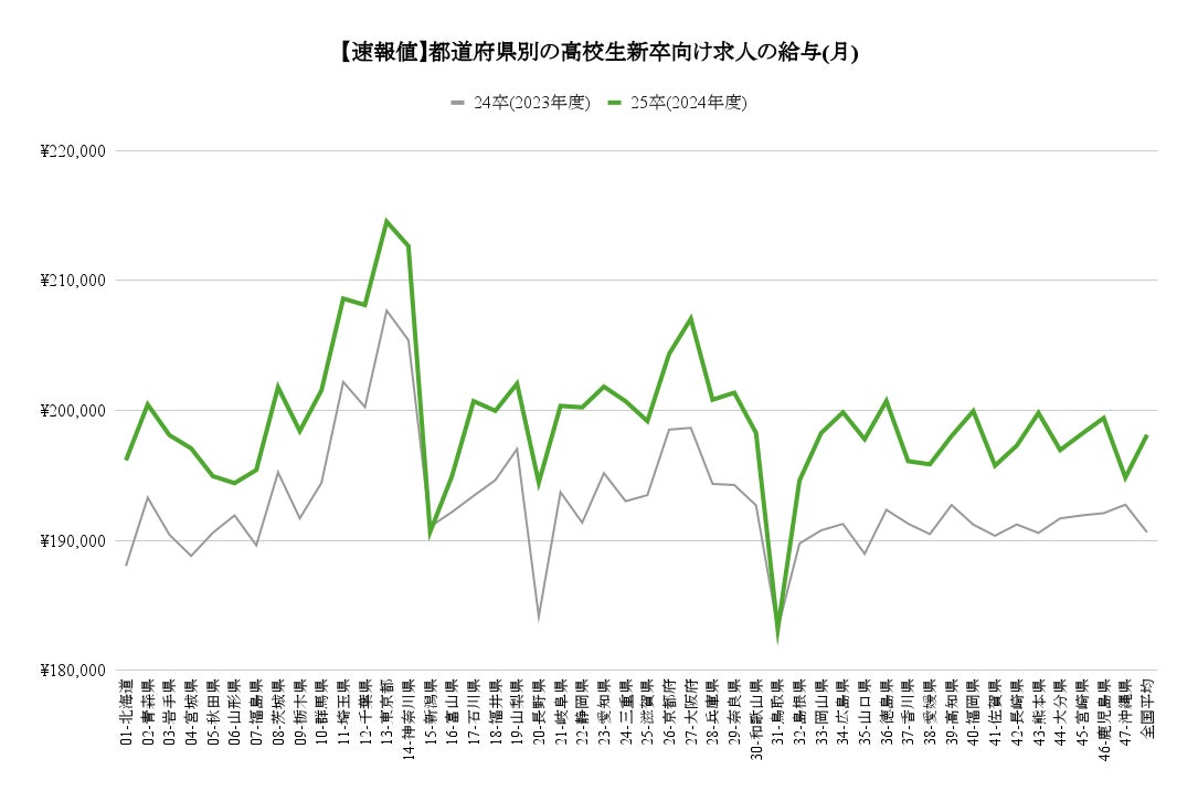 【速報】25卒の高卒新卒者向けの給与は上昇し、198,119円に!前年比較で+7,500円/月の改善(+3.9%)。若年労働力の確保を目指す求人企業の本気度合いが反映される結果に。