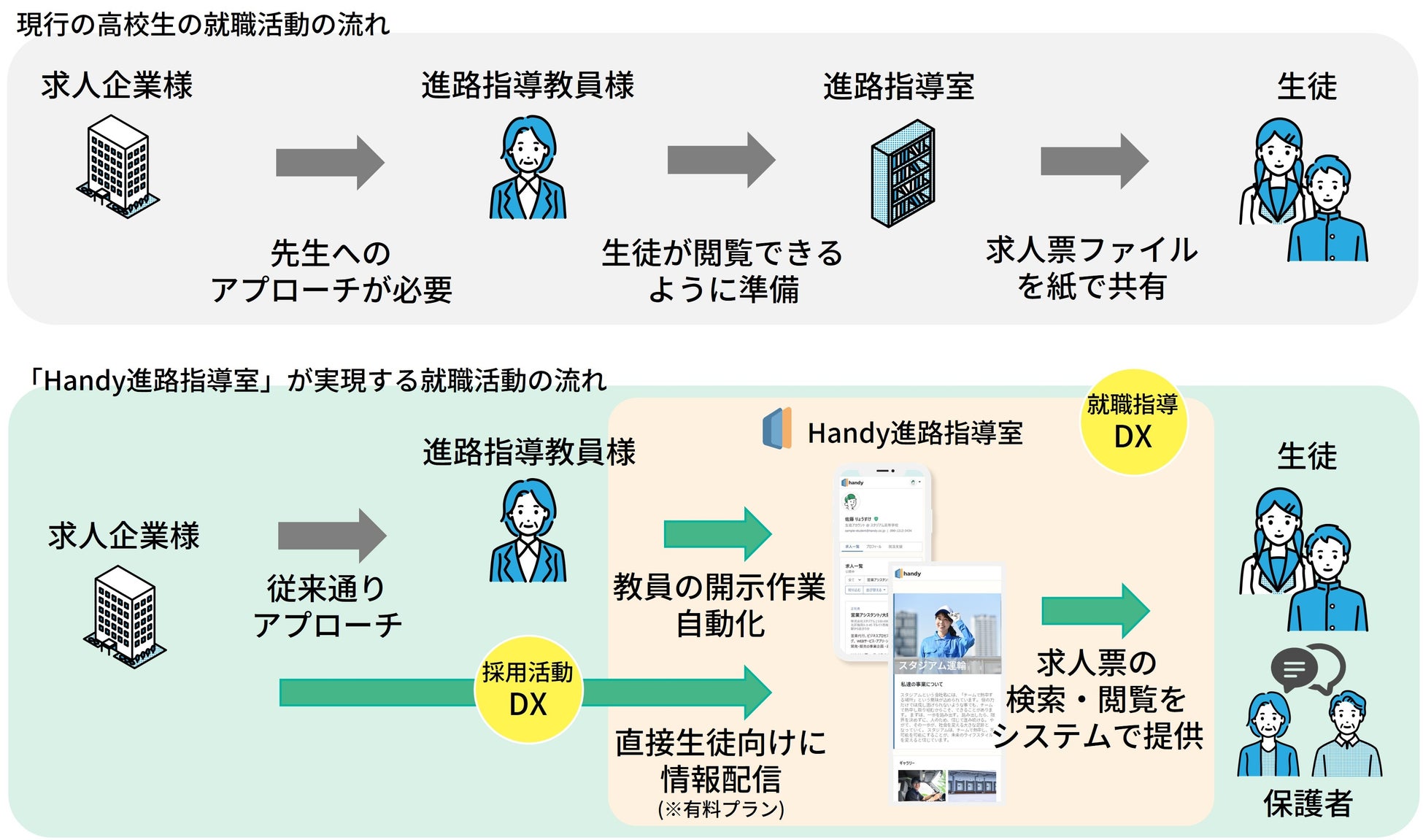 すでに、全国の高校のうち、高校生の就職希望者の50%以上を輩出される1,300校以上が、当社の提供する求人票デジタル管理システム「Handy進路指導室」をご利用いただいております。