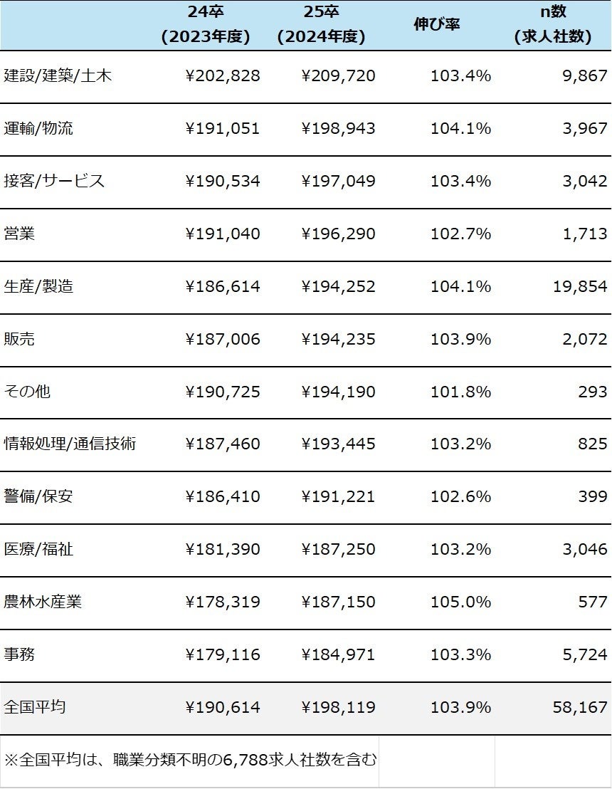 職業分類別(*)では、建設関係が引き続きけん引し、20.9万円に。24年問題に直面する運輸/物流業界も19.8万円台にアップ。