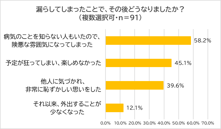「漏らしてしまった」と回答した91人に「その後どうなったか?」尋ねたところ、「病気のことを知らない人もいたので、険悪な雰囲気になってしまった」(58.2%)、「他人に気づかれ、非常に恥ずかしい思いをした」(39.6%)など、その方個人の尊厳や自信を大きく損なう回答が目立ちました。また、「それ以来、外出することが少なくなった」という方も1割超(12.1%)おり、日常生活に制限をかけてしまっている方がいらっしゃることは否めない結果となりました。