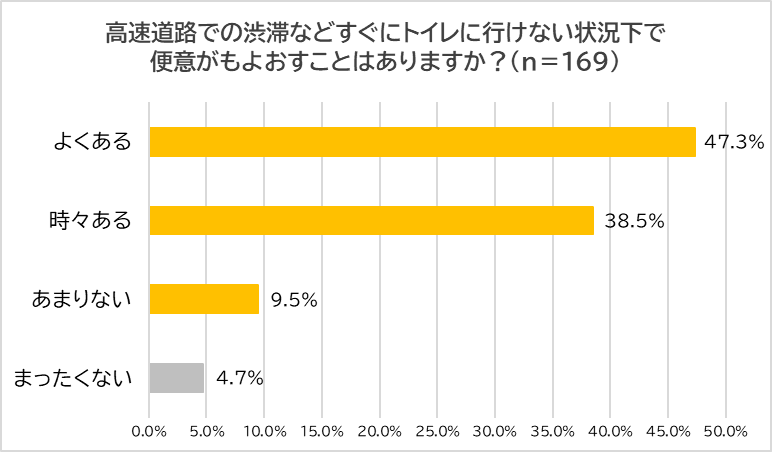 「高速道路で渋滞などすぐにトイレに行けない状況下で便意がもよおすことはあるか?」と尋ねたところ、「よくある」(47.3%)、「時々ある」(38.5%)、「あまりない」(9.5%)、「まったくない」(4.7%)となりました。IBDやIBSの患者さんは、物理的にトイレに行けないという不安やストレスでより発症しやすくなるため、9割弱(85.8%)の方がつらい経験をしていることがわかります。