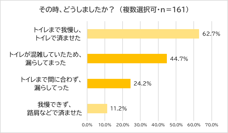 トイレに行けない状況下で便意をもよおすことが「よくある」「時々ある」「あまりない」と回答した161人に「その時、どうしたか?」尋ねました。「トイレまで我慢し、トイレで済ませた」(62.7%)が最多でしたが、「トイレが混雑していたため、漏らしてしまった」(44.7%)、「トイレまで間に合わず、漏らしてしまった」(24.2%)など漏らしてしまった方も6割弱(56.5%)いました。また、「我慢できず、路肩などで済ませた」も1割超(11.2%)いました。