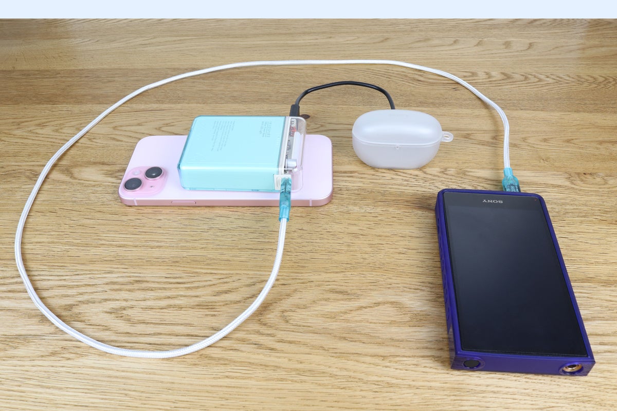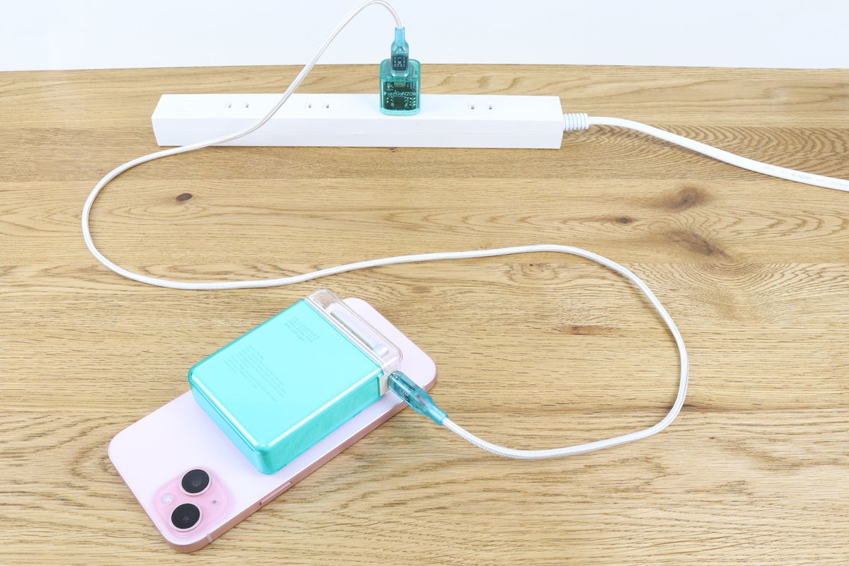 USB-Cポートでモバイルバッテリーを充電しながらデバイスへの充電が可能です。iPhone15+内蔵バッテリーに約240分でフル充電できます。
