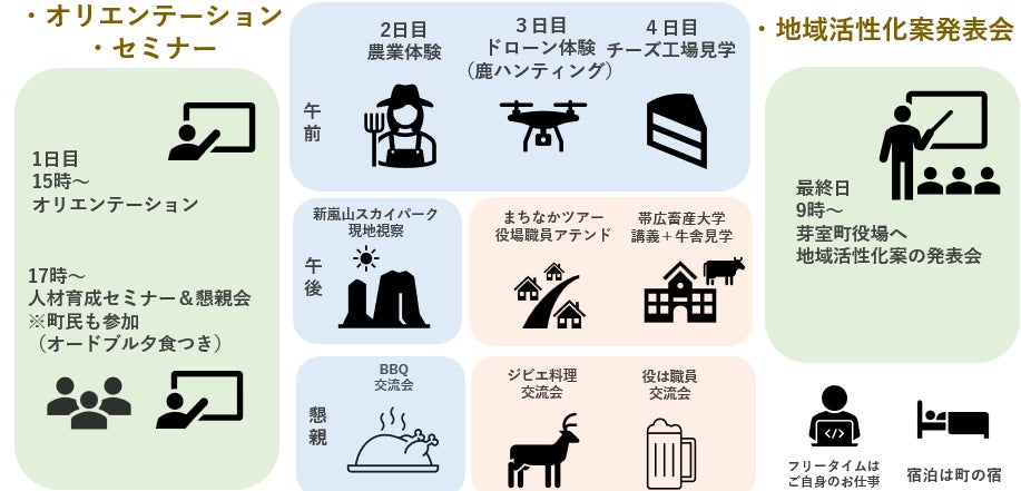 経済産業省 令和6年度「地域の中堅・中核企業の経営力向上支援事業補助金(地域戦略人材確保等実証事業)の採択を受けて実施。多数のエントリー者の中から選ばれた、WEBマーケターや戦略コンサルタント、エンジニアやメディア運営者など、様々な経歴・背景を持つ多種多様な人材15名が北海道河西郡芽室町で【働く・暮らす】を体験する4泊5日のツアーです。自身の仕事をリモートでやりつつ、農業、酪農、ドローン事業などの職業体験を実施しながら学び、地元の方々と交流し、芽室が持つ可能性を共に模索していく事業です。