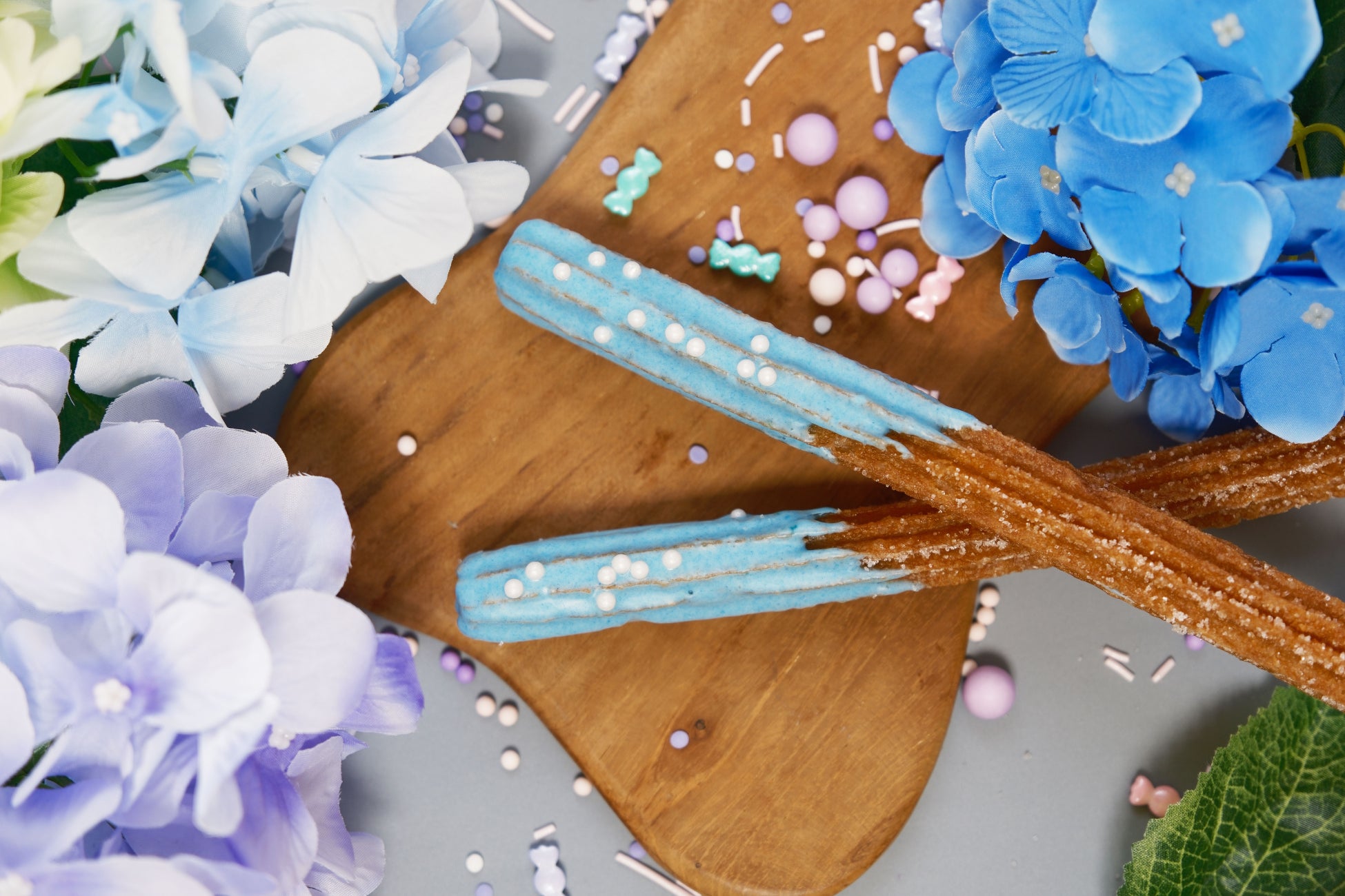 あじさいの色のチョコレートコーティングとシュガートッピングで、あじさいの花と滴る雨粒を表現したチュロス。