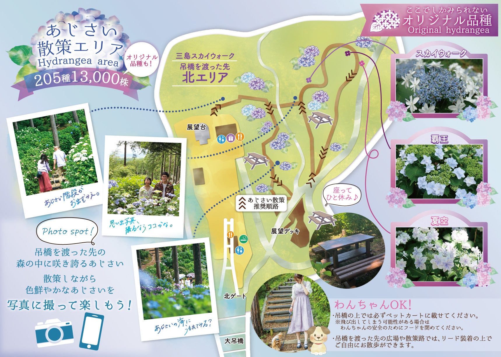 全長400m、日本一の歩行者専用つり橋「三島スカイウォーク」(所在地:静岡県三島市、運営:株式会社フジコー、本社:静岡県三島市、代表:宮澤俊二)は、全205品種、13,000株のあじさいを楽しめる『あじさい祭』を、つり橋を渡った先の北エリアにて2024年6月8日(土)~7月15日(月・祝)の期間、開催いたします。また、週末9日間限定で夜のライトアップや、あじさいをイメージした限定スイーツの販売も行います。あじさい祭詳細ページ:https://mishima-skywalk.jp/ajisai/