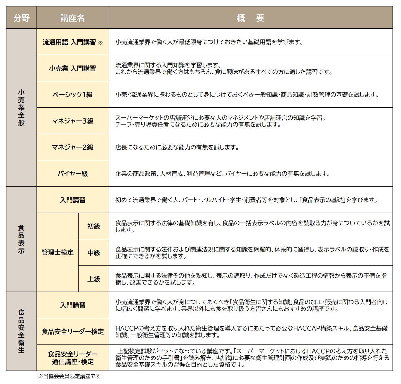 スーパーマーケットをはじめとする小売業や流通業で働く人の知識と技術の向上を目的とした検定試験で、厚生労働省が策定した「職業能力評価基準」※に準拠しており、「小売業全般」「食品表示管理士」「食品安全衛生」の3分野において、キャリア・興味に合わせて受検・受講が可能です。