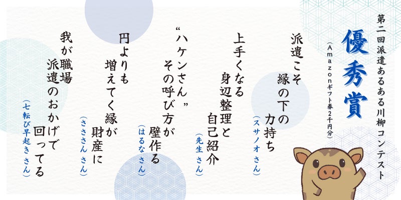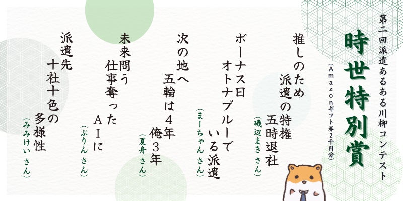 今回も「ハケンさんと言われ名前が呼ばれない」「名前を覚えてもらえない」という川柳を、非常に多くご投稿いただきました。派遣社員を経験したことのある事務局審査員の目に留まった、切ない思いが伝わる一句が評価の対象となりました。