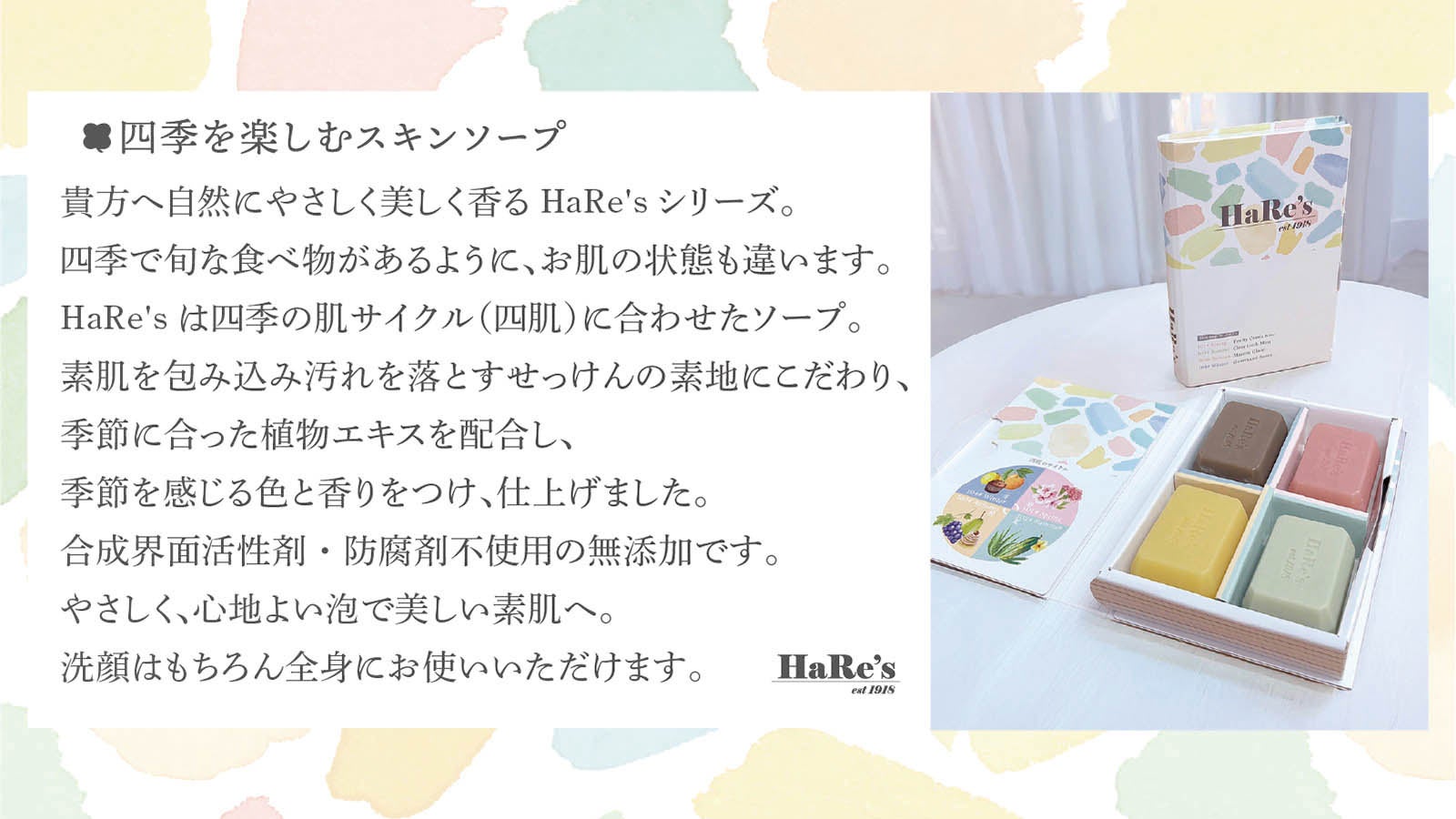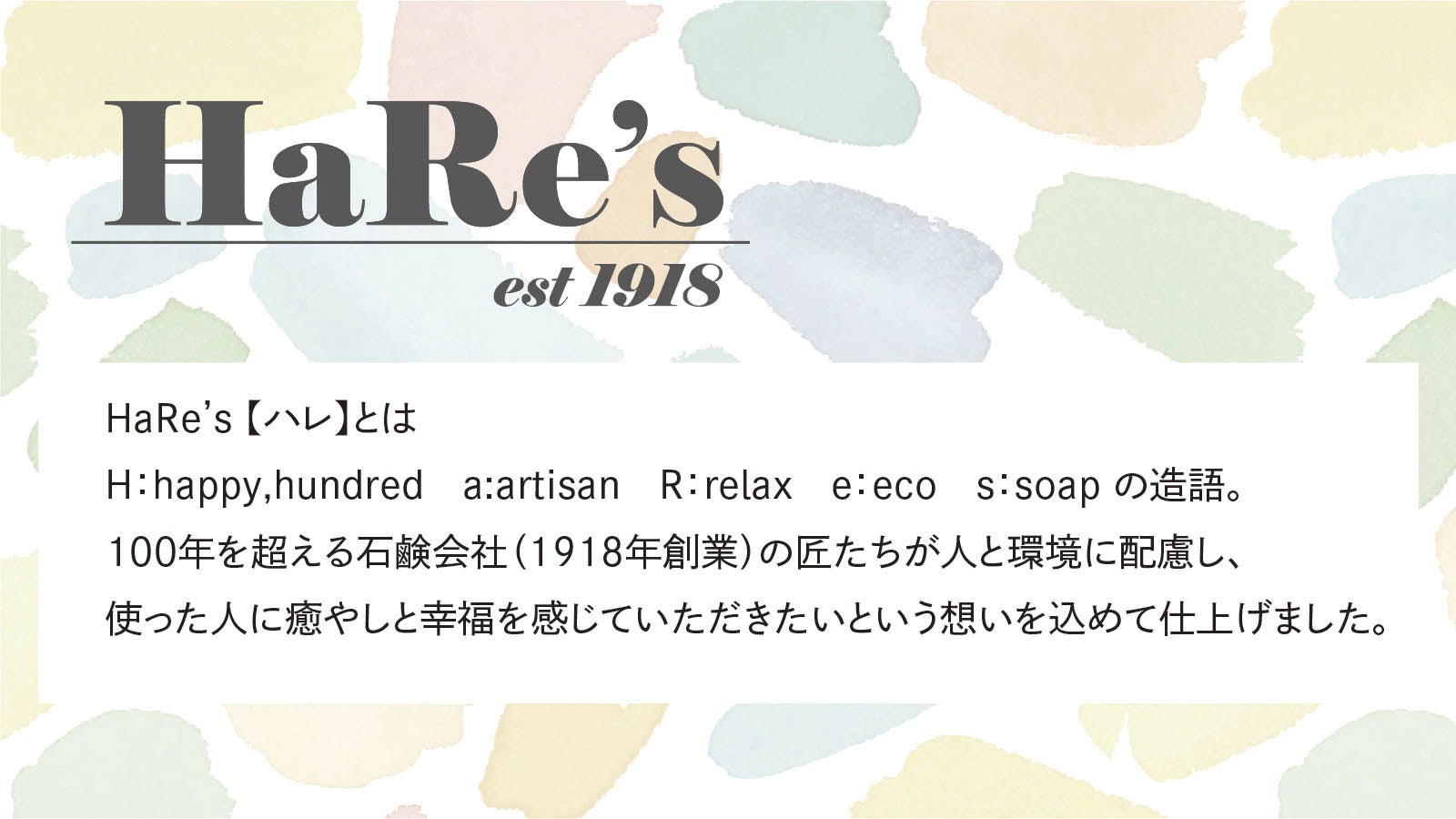 HaRe’sは「happy, hundred/artisan/relax/eco/soap」を組み合わせた造語。100年を超えて培った石鹸職人の技と想いを込めた癒しと幸せを届けるシリーズ。自然派志向や成分にこだわる方、固形石鹸未体験の方も、一度使えば手放せなくなる心地よさ。石鹸の匠が仕上げた泡と香りをお楽しみください。