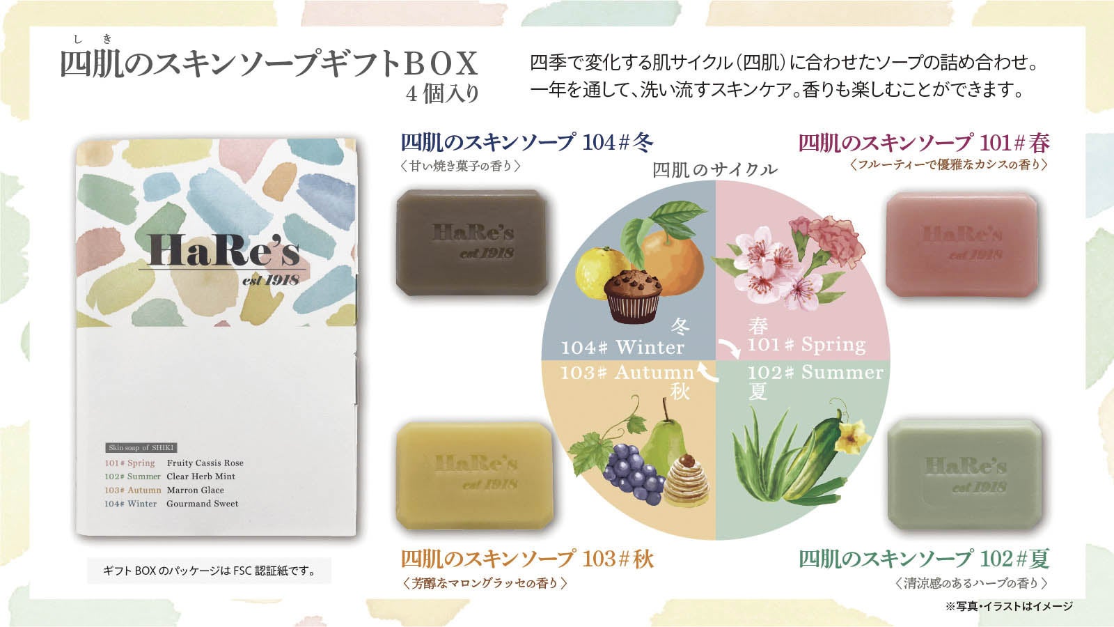 ヱスケー石鹸が107年かけて磨いた技で仕上げた固形石鹸の詰め合わせ、春夏秋冬を楽しむ「四肌(しき)のスキンソープギフトBOX」