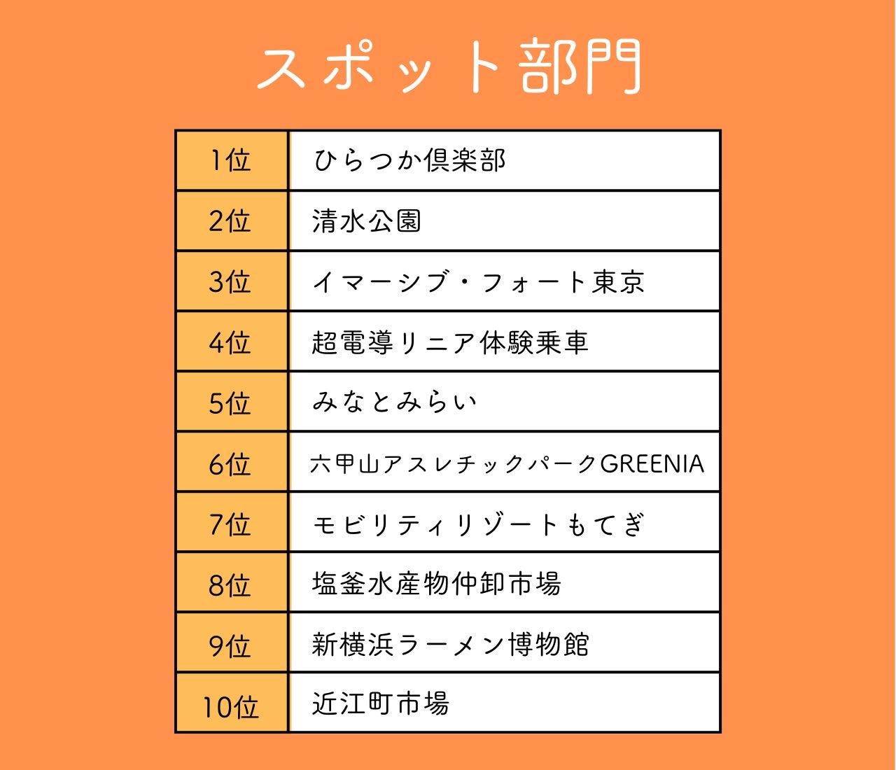 観光スポット部門については、全体的に「体験型」がキーワードになっています。特にひらつか倶楽部や清水公園など、家族で楽しめる施設が注目されています。ひらつか倶楽部は自分で焼く浜焼きバーベキュー、清水公園は動物やアスレチックといった体験が可能で、家族層や若年層を中心に人気を集めていることがわかります。