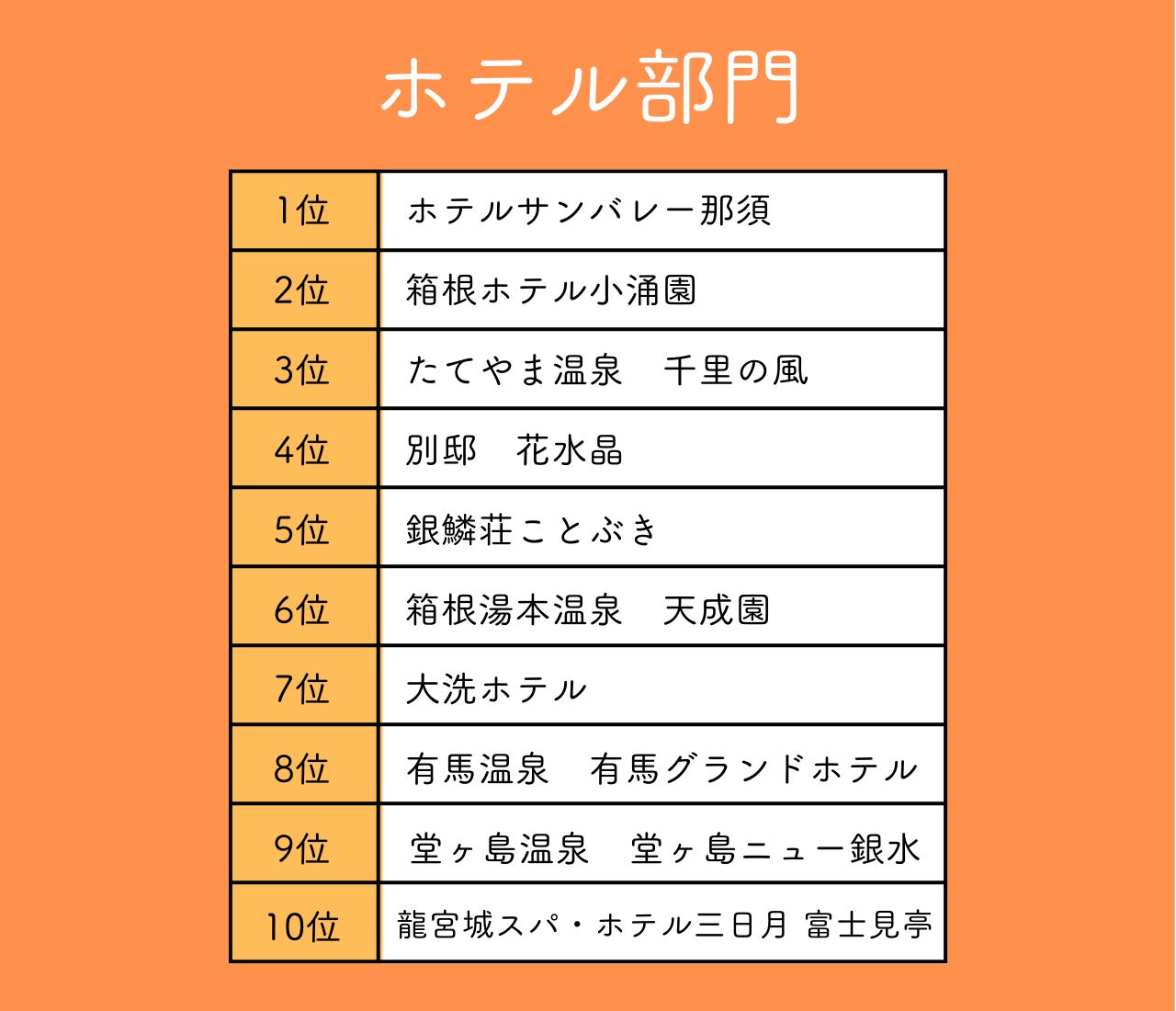 ホテル部門に関しては、ホテルサンバレー那須や箱根ホテル小涌園などの温泉地にある施設が人気です。また、夕食や朝食で「ビュッフェ」を楽しめる施設が好まれています。